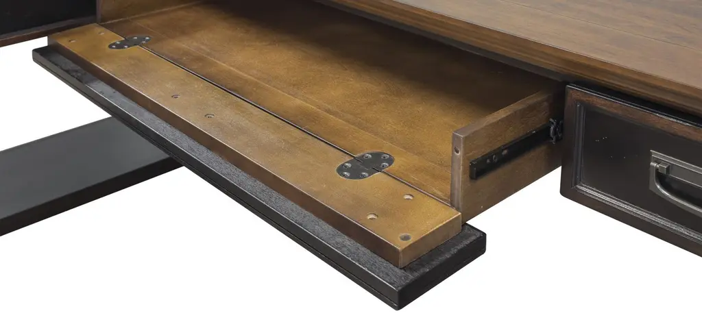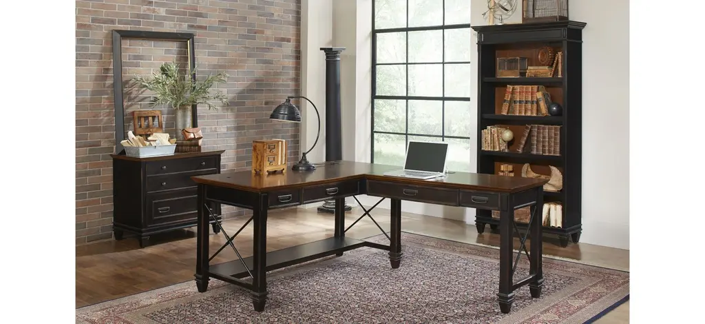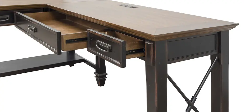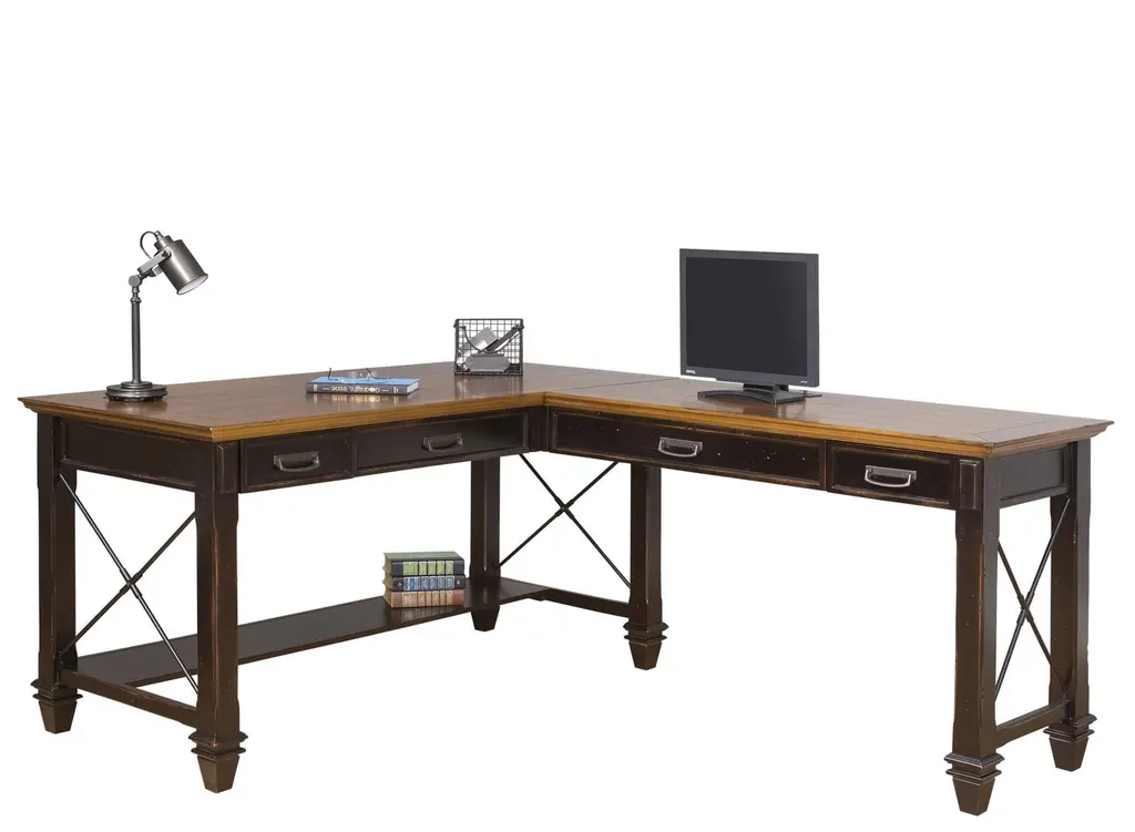 The Hartford executive L-shaped computer desk offers a casual interpretation of classic style. This contract grade piece features a two-tone finish in contrasting colors. Metal accents and wire mesh details finish this desk beautifully.