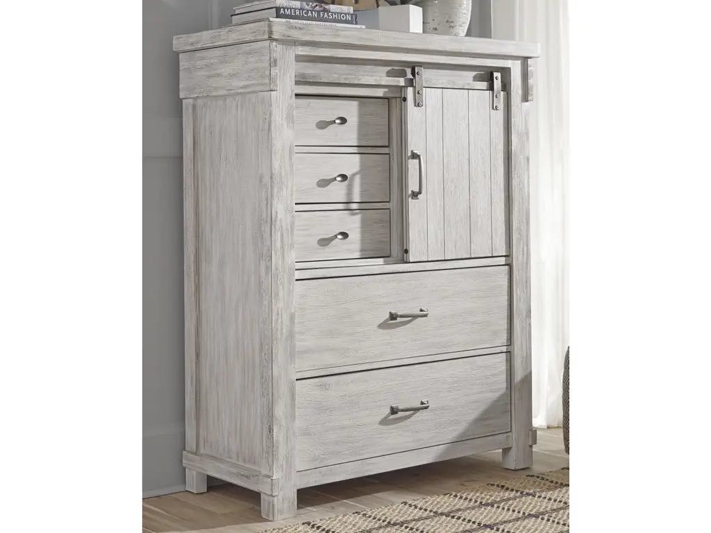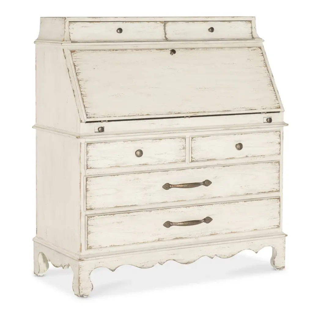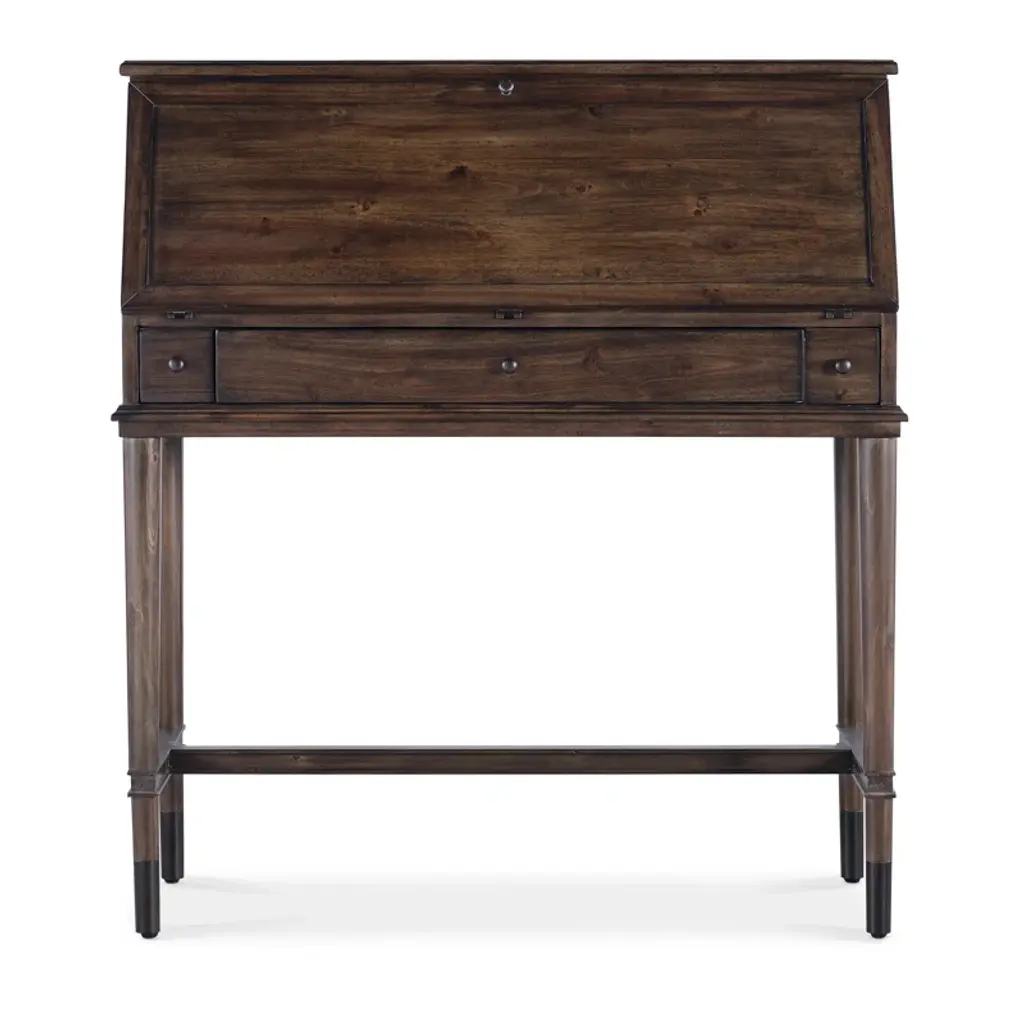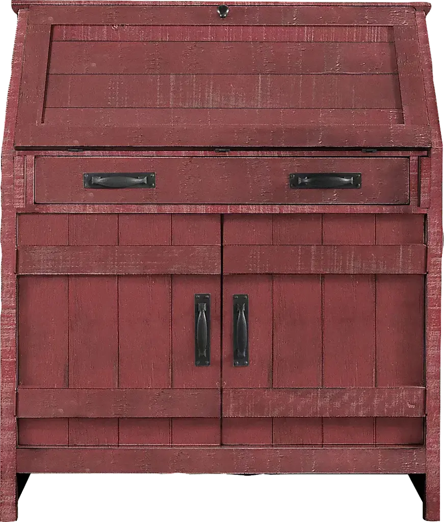Imparting a bold rustic look, the Havenwood desk sets the tone for a handy home office. Constructed with pine solids and veneers, this piece boasts a distressed red finish with wood plank styling. A drop lid unfolds to reveal the desk surface, which can be conveniently closed again for privacy or to save space. Underneath, a drawer and two cabinet doors offer additional storage. Compartments located in the hutch make it easy to stay organized, while a power strip containing two outlets and two USB ports charges your devices. For industrial-inspired style, hardware features a gleaming gunmetal finish.