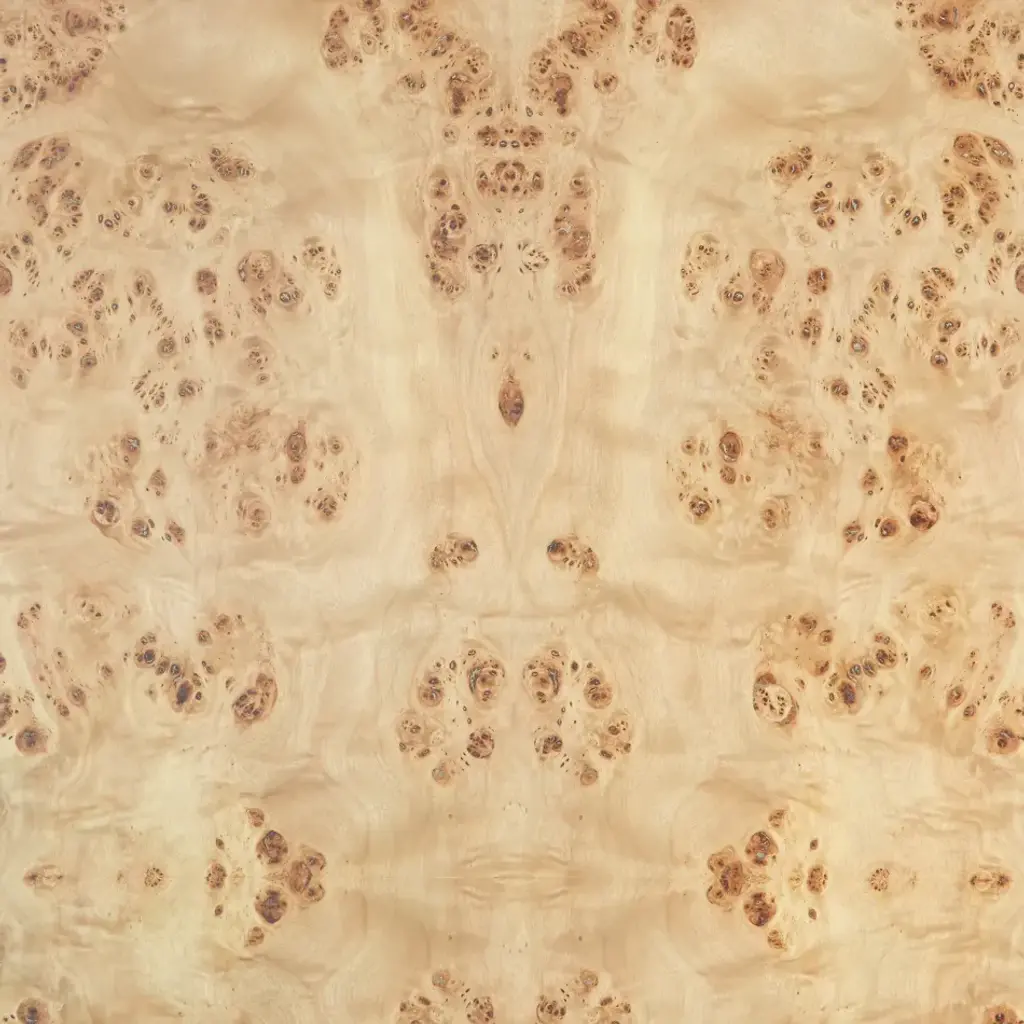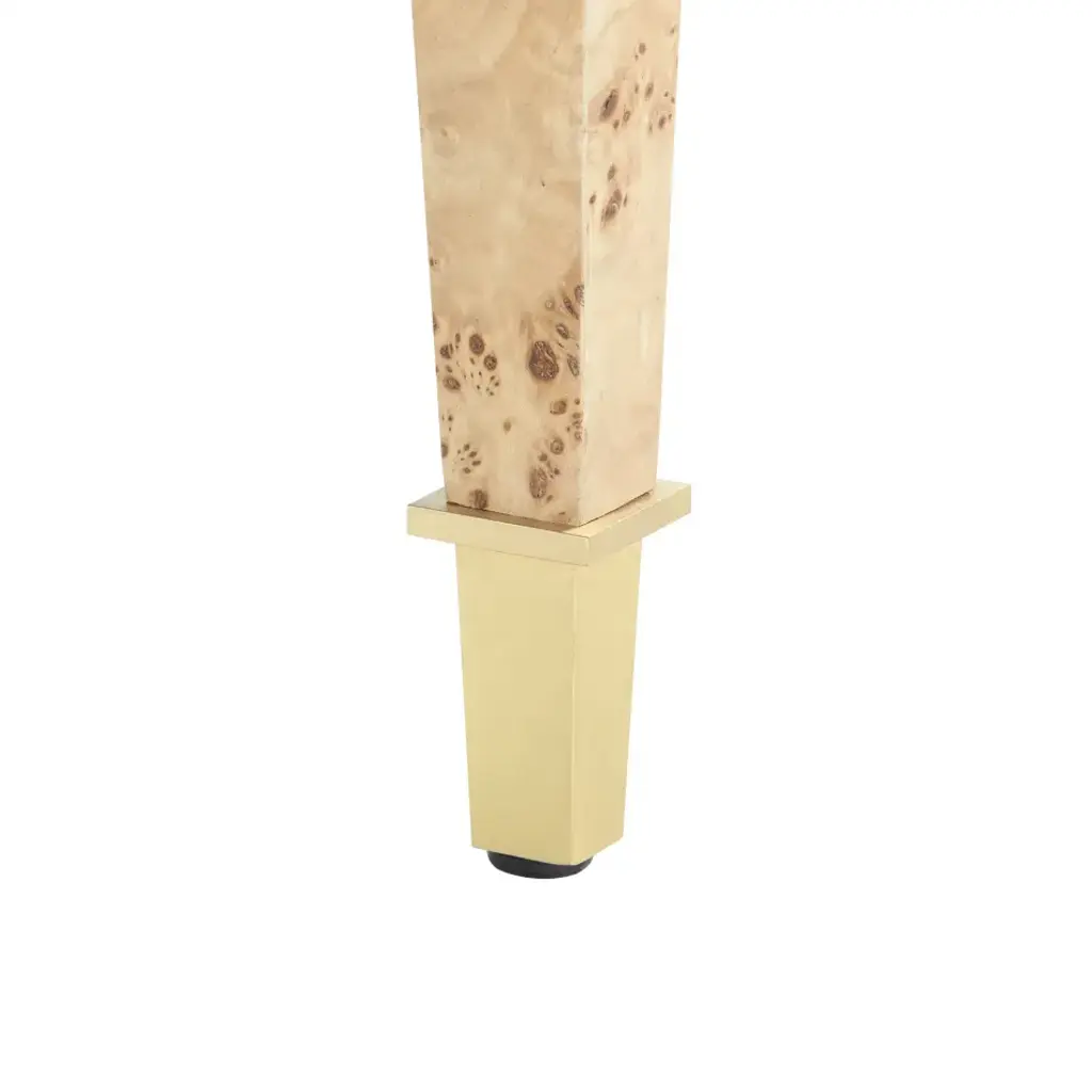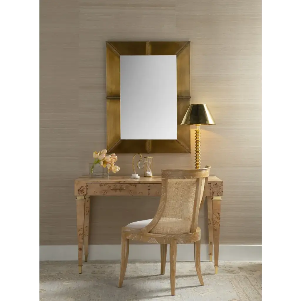 Gilded Age elegance finds a home in the Helena Desk. Its svelte silhouette is realized in a light burl wood. A smooth sheen of lacquer serves to spotlight the natural swirls and patterns of the material, giving the piece a marbleized effect. The shine of brushed brass hardware could be found in its accents, sabots, and pulls. Two slender drawers on soft-closing glides float below the top for easy access to documents or office supplies. With the Helena, working from home has never looked (or felt) so chic.