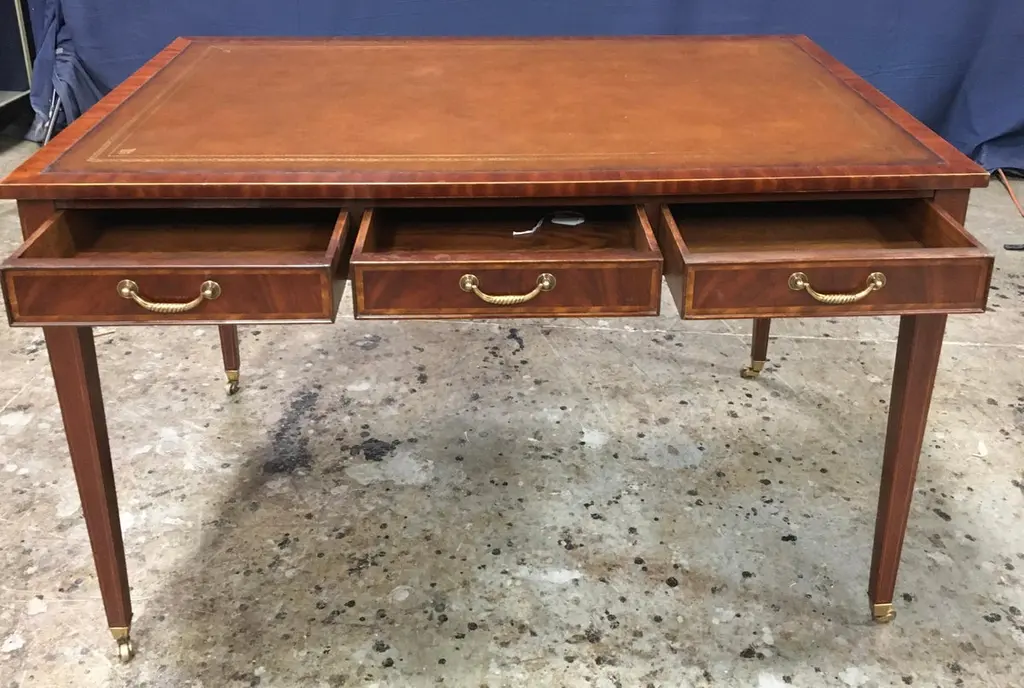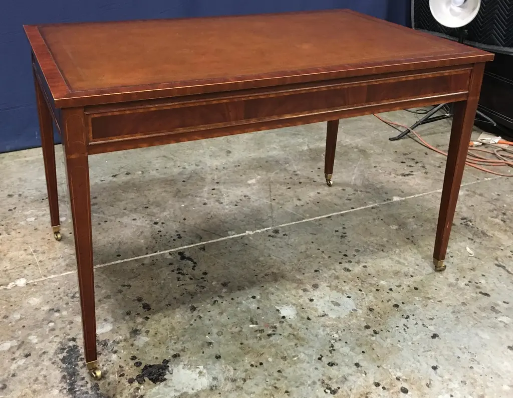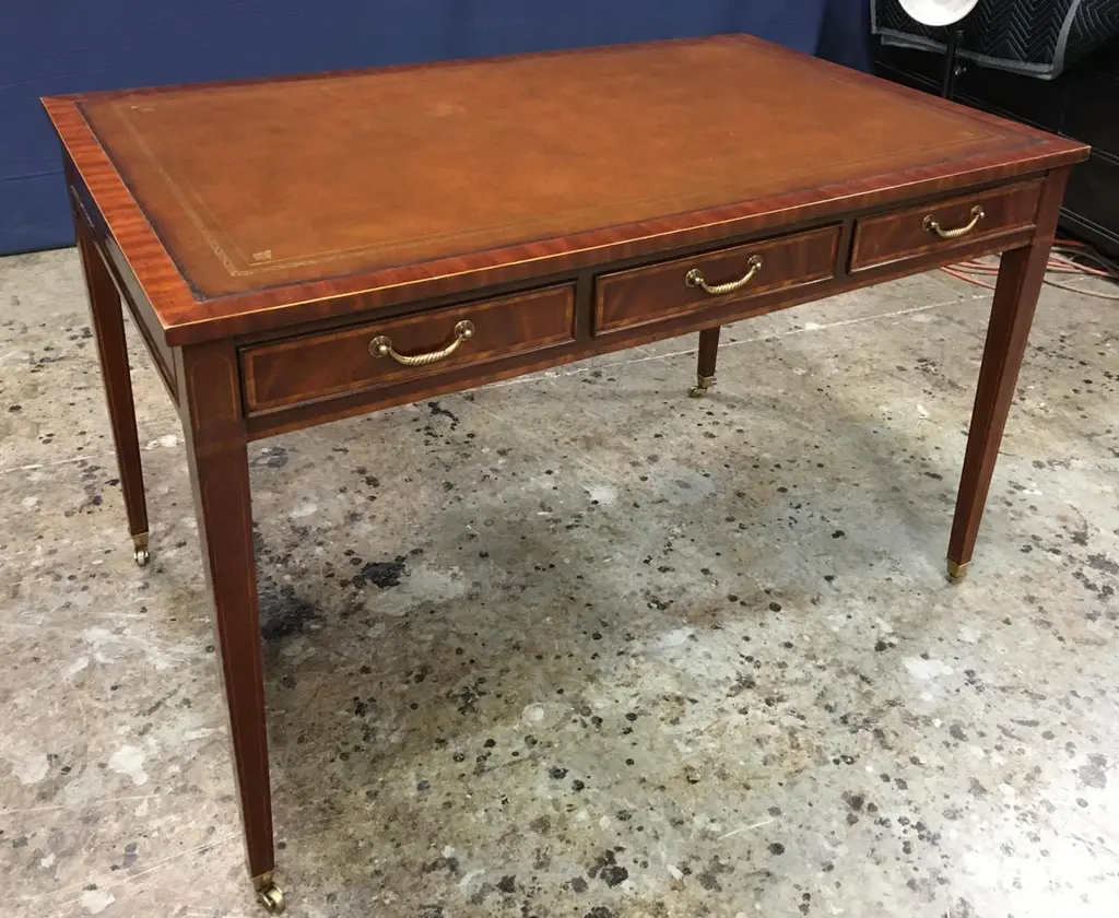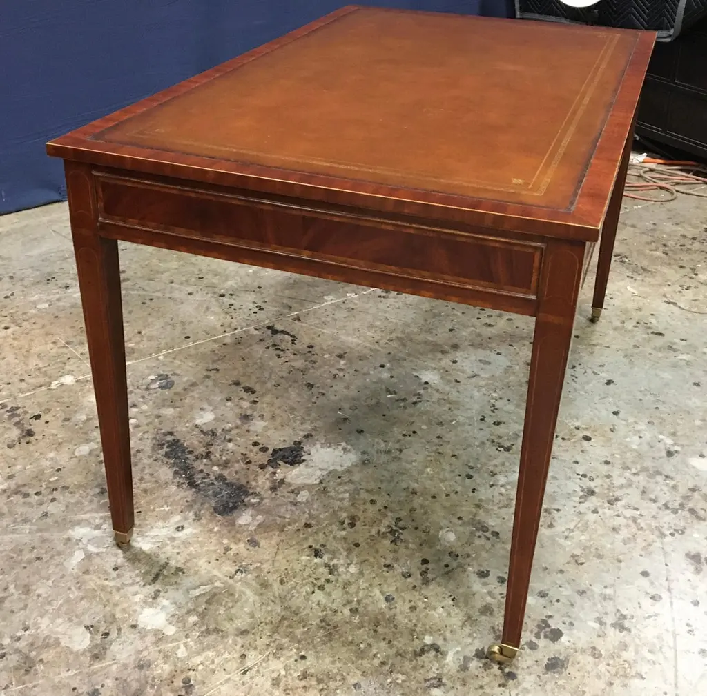 This is a new Hepplewhite style writing desk. It is ideal for the home office, library, or reception area in a business setting. It features a top of brown leather with gold tooling. Its front, back and side panels and drawers have crotch mahogany fields. The drawers are masterfully dovetailed and it has solid brass hardware. The desk is a medium brown mahogany color with a hand steel wool rubbed and polished satin finish. Suggested retail price is $4,995..Dimensions: Width: 48 in.; Depth: 30 in.; Height: 30 in.; Kneehole Clearance: 25 in.Optional features include optional finishes, hardware, locks and holes for computer wiring.Special Note: Due to supply chain shortages and delays, we are temporarily suspending some options for this item.
