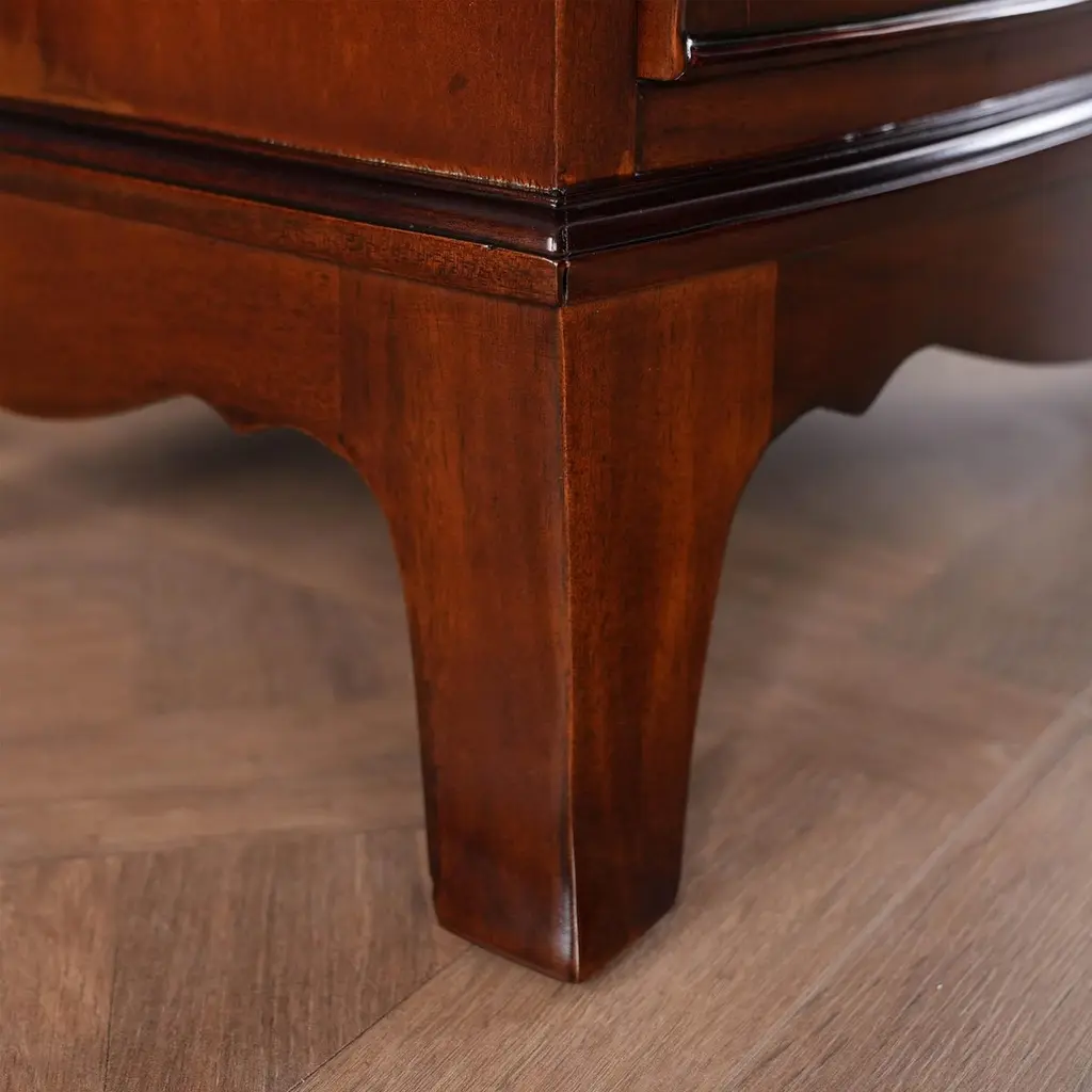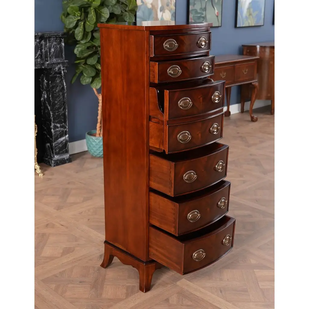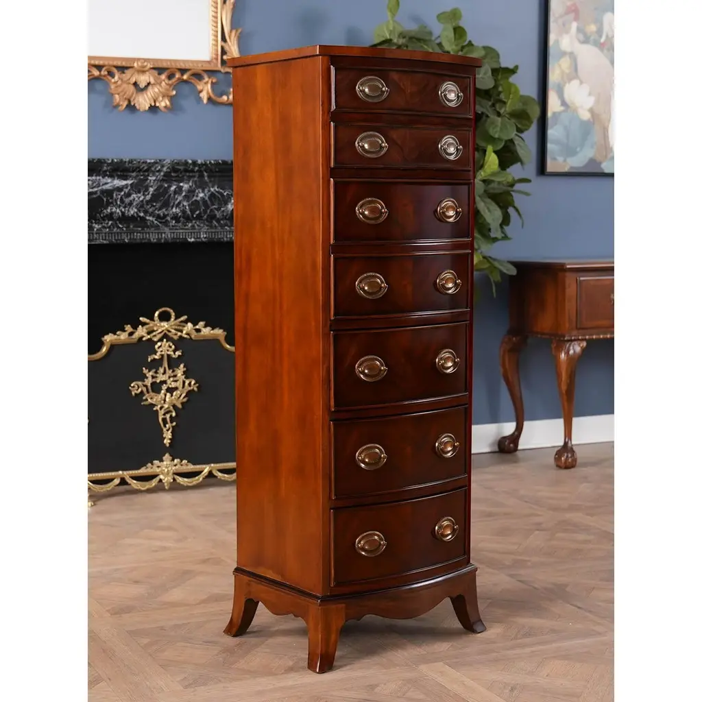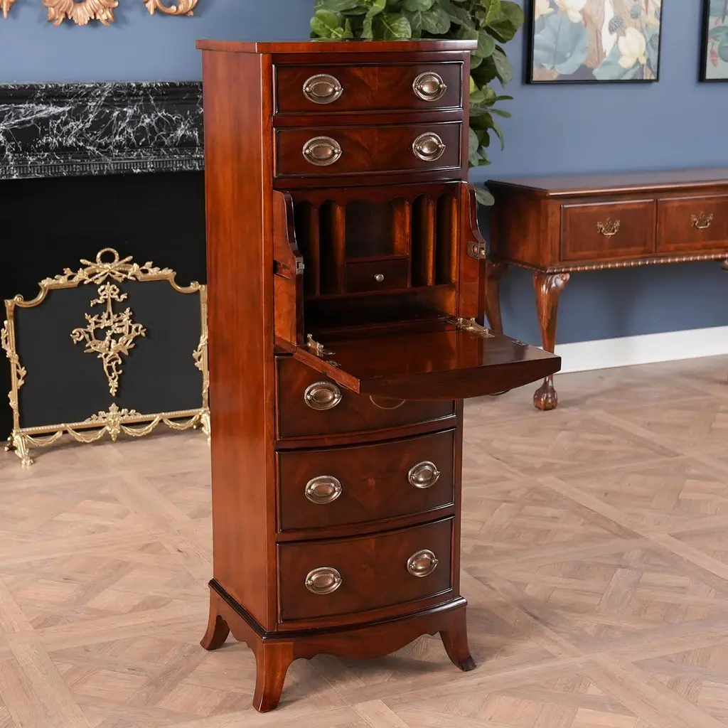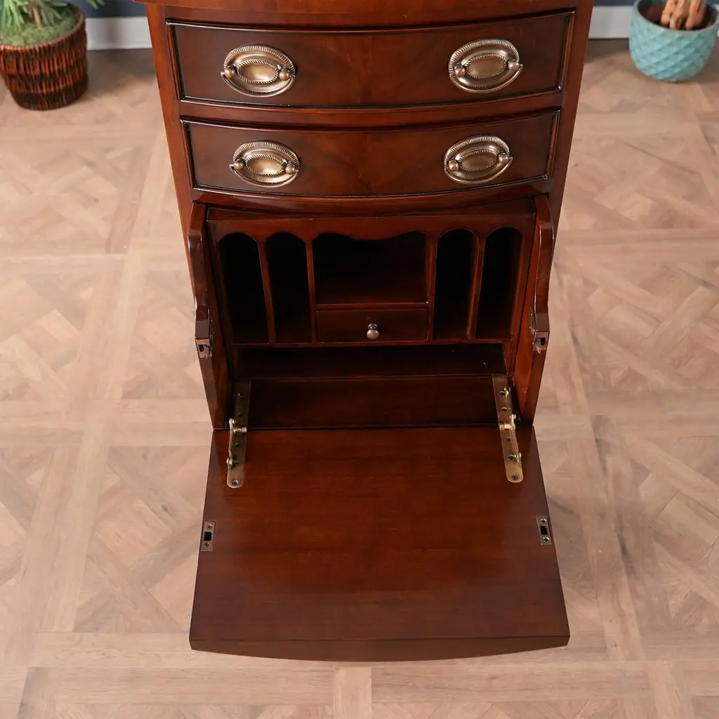 The Niagara Furniture Hidden Drawer Desk, a luxury piece of fine furniture with a hidden surprise inside. This tall chest was originally designed for lingerie but we have redesigned it to hold a small writing desk with a small drawer, and storage spacers. Great for use with tablets or a small lap top, everything hides away when you close the drop down lid. Hard to find vertical storage, all on beautifully shaped legs with attractive bow front graduated drawers. Matches many pieces in the Niagara Hepplewhite Bedroom Collection.Measures 19″w x 15″d x 53.5″ h metric 48 38 137