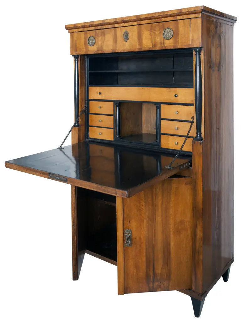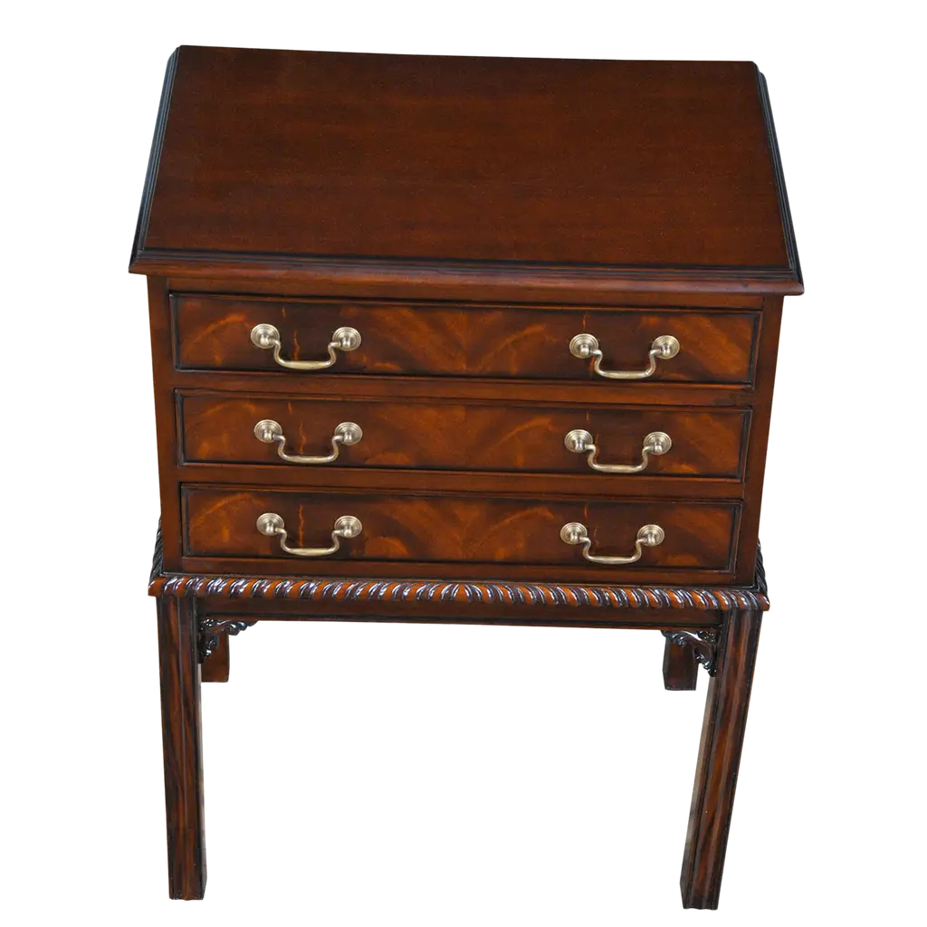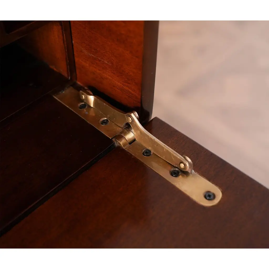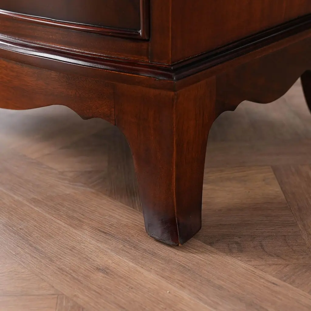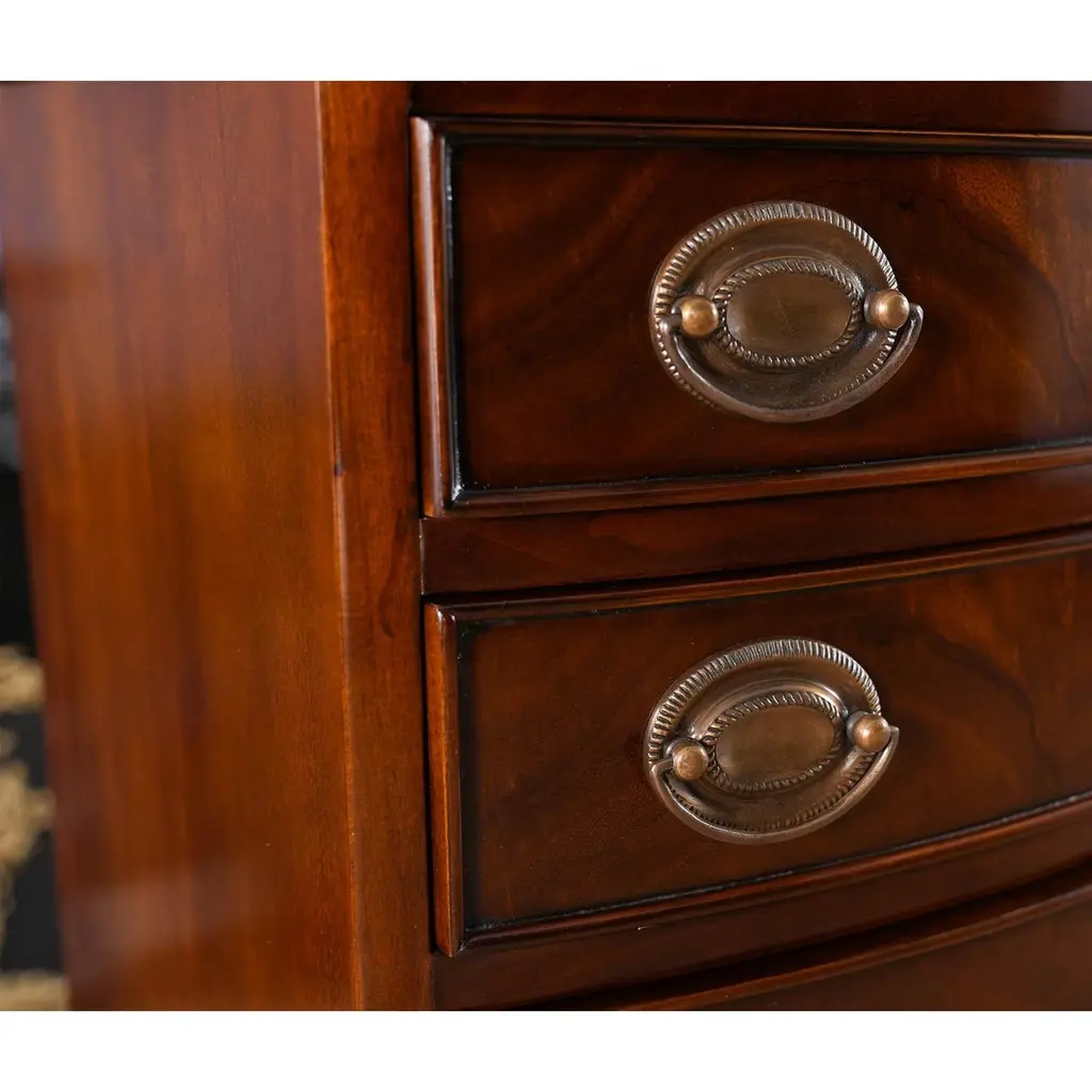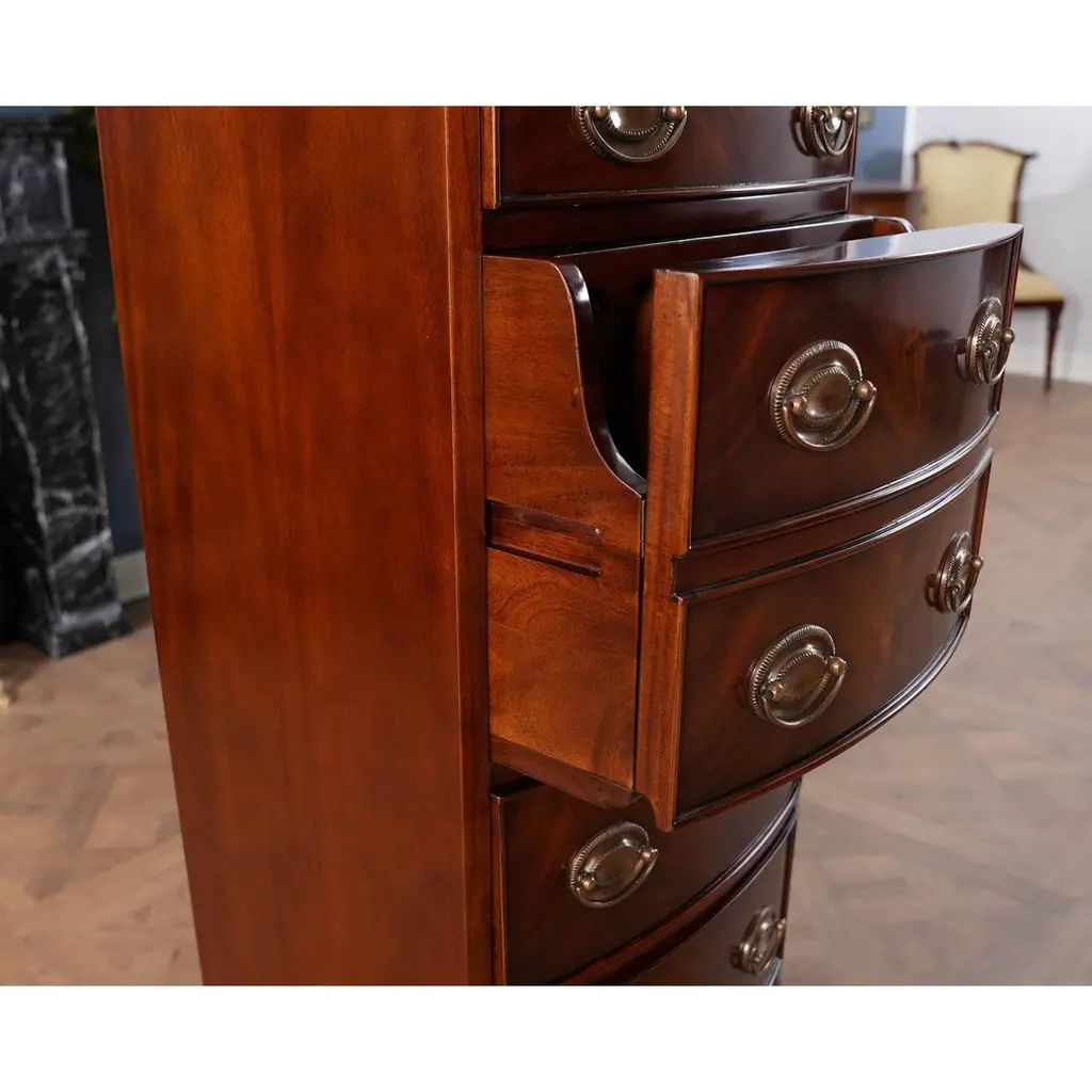 The Niagara Furniture Hidden Drawer Desk, a luxury piece of fine furniture with a hidden surprise inside. This tall chest was originally designed for lingerie but we have redesigned it to hold a small writing desk with a small drawer, and storage spacers. Great for use with tablets or a small lap top, everything hides away when you close the drop down lid. Hard to find vertical storage, all on beautifully shaped legs with attractive bow front graduated drawers. Matches many pieces in the Niagara Hepplewhite Bedroom Collection.Measures 19″w x 15″d x 53.5″ h metric 48 38 137