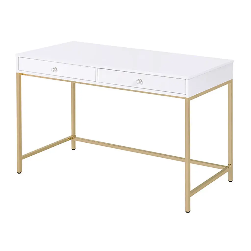 This rectangular writing desk boasts a contemporary style, perfect for modern interiors; This contemporary writing desk features a high gloss finish and a gold metal base that add elegance and style to any home office or study room; The desk has two spacious drawers with crystal-like knobs that provide ample storage space for your office supplies, documents, or personal items; Supported by a metal leg base with a luxurious gold finish, combining durability with elegance.