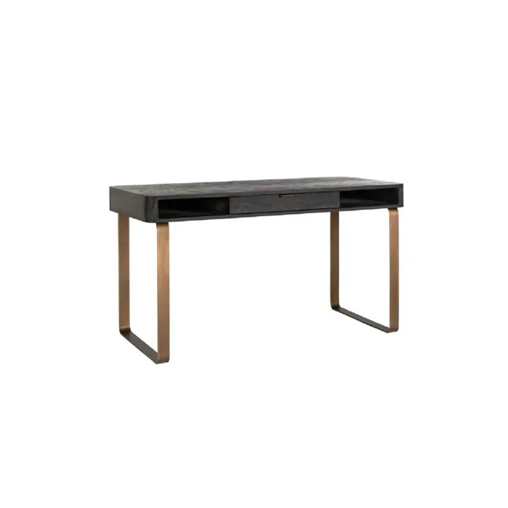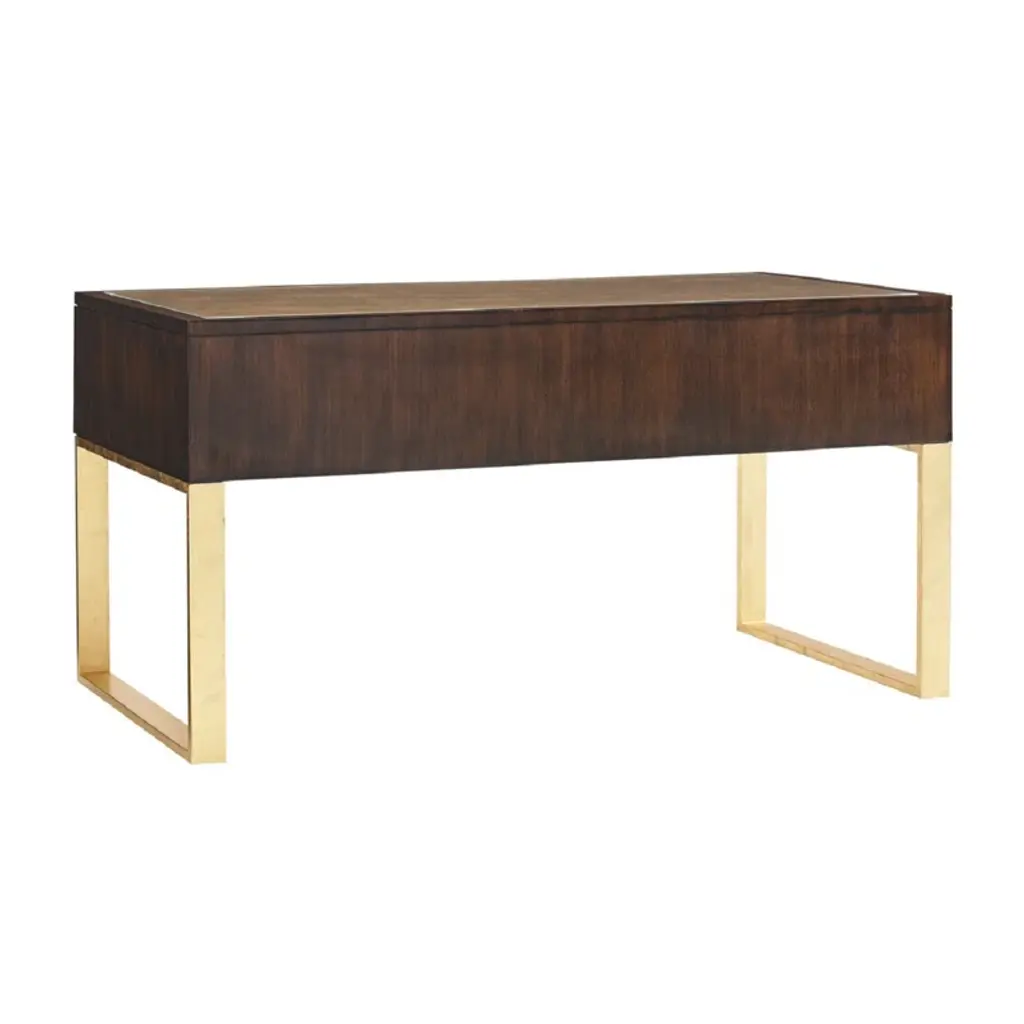 This rectangular writing desk boasts a contemporary style, perfect for modern interiors; This contemporary writing desk features a high gloss finish and a gold metal base that add elegance and style to any home office or study room; The desk has two spacious drawers with crystal-like knobs that provide ample storage space for your office supplies, documents, or personal items; Supported by a metal leg base with a luxurious gold finish, combining durability with elegance.