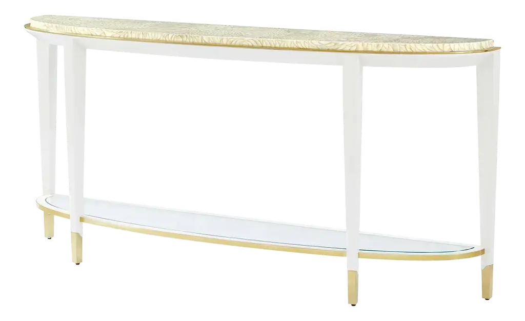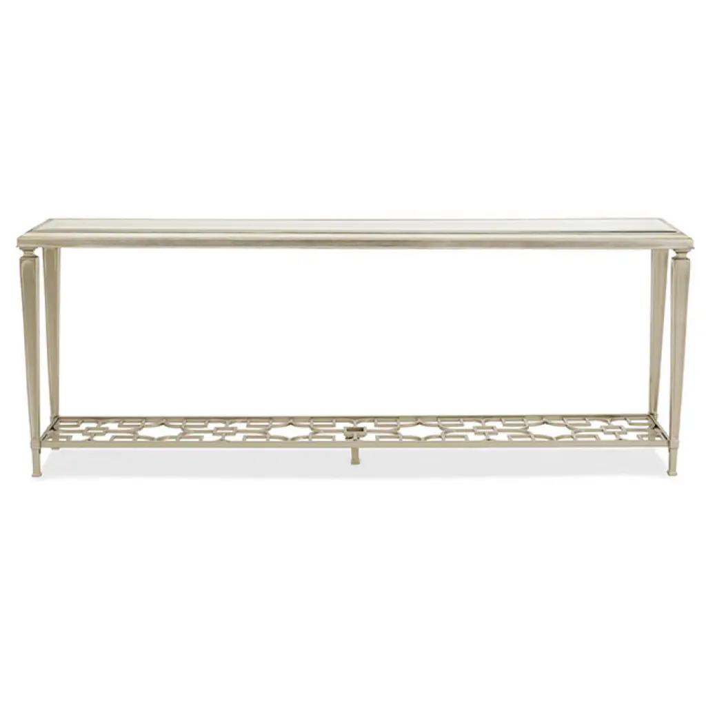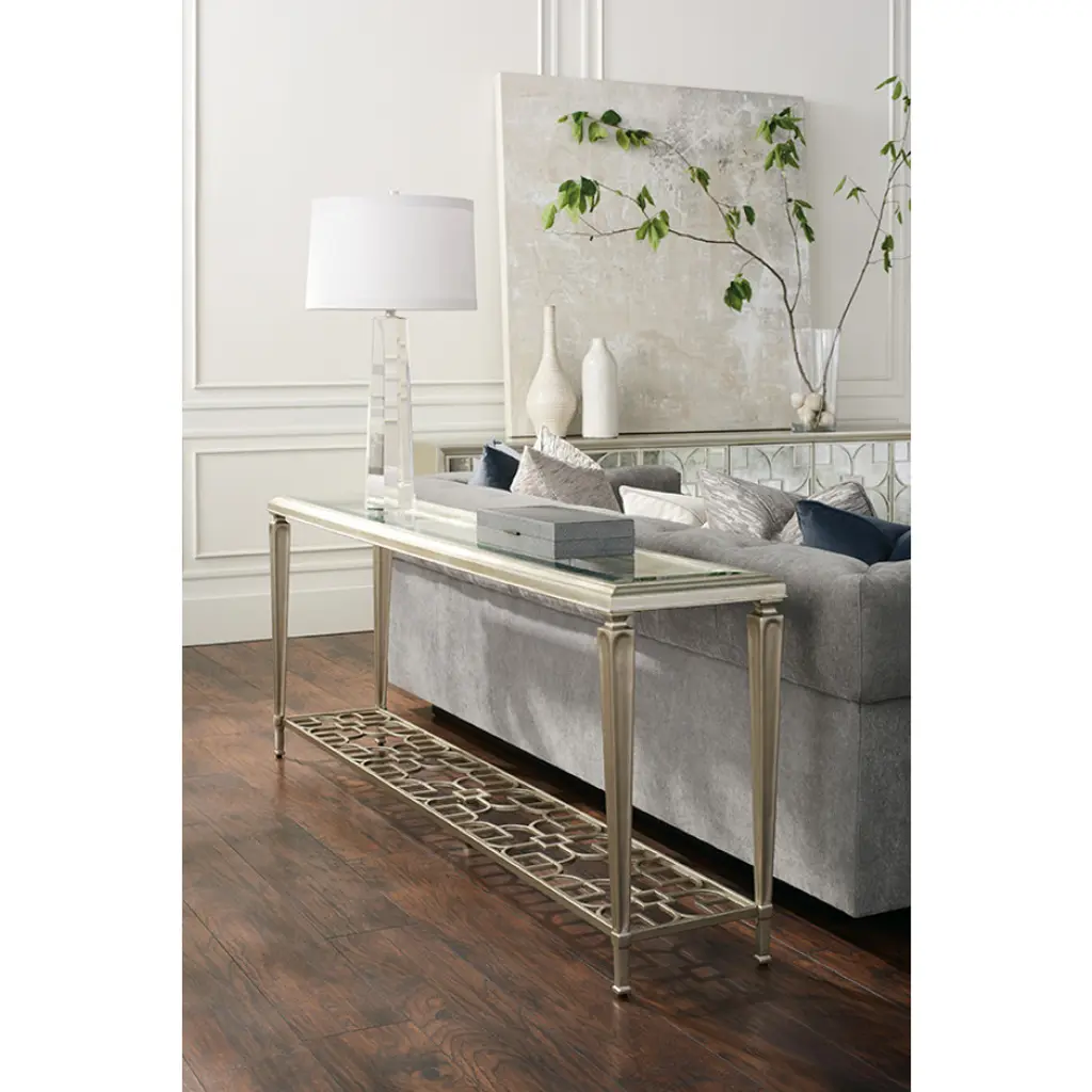 Open and alluring, this distinctive console table makes a bold statement. Its airy design is elegant in its simplicity and features an exquisite metal fret-patterned shelf that can be seen through its glass top. Tall metal legs reach skyward and support its clear glass top with 1 ¼” bevel. Finished in Taupe Paint and Taupe Silver Lear, it’s perfect for behind a sofa or anywhere you need a touch of elegance.