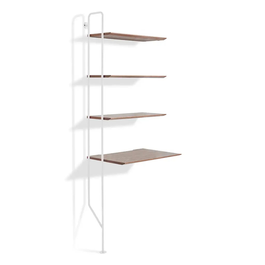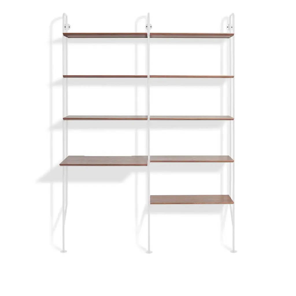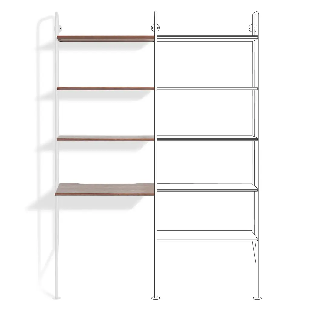 Powder-coated steel uprights and wood shelves in multiple finish options make you the master of your own book case destiny. We added a desk with the perfect work surface for even more choices. Single units stand alone. Gang up multiples to create mass appeal.Please note: The Hitch Add-on unit requires attachment to a Hitch Bookcase. Shown with one Hitch Bookcase and one Add-on unit.