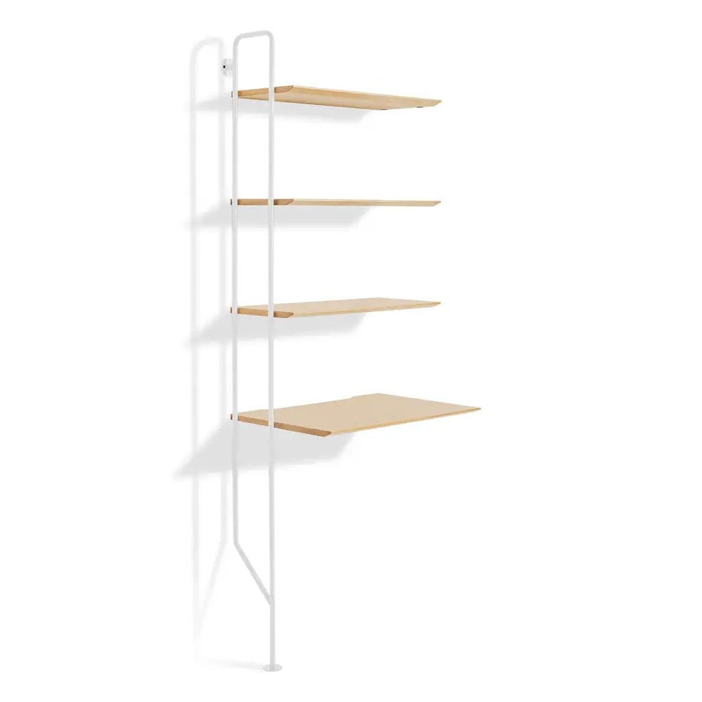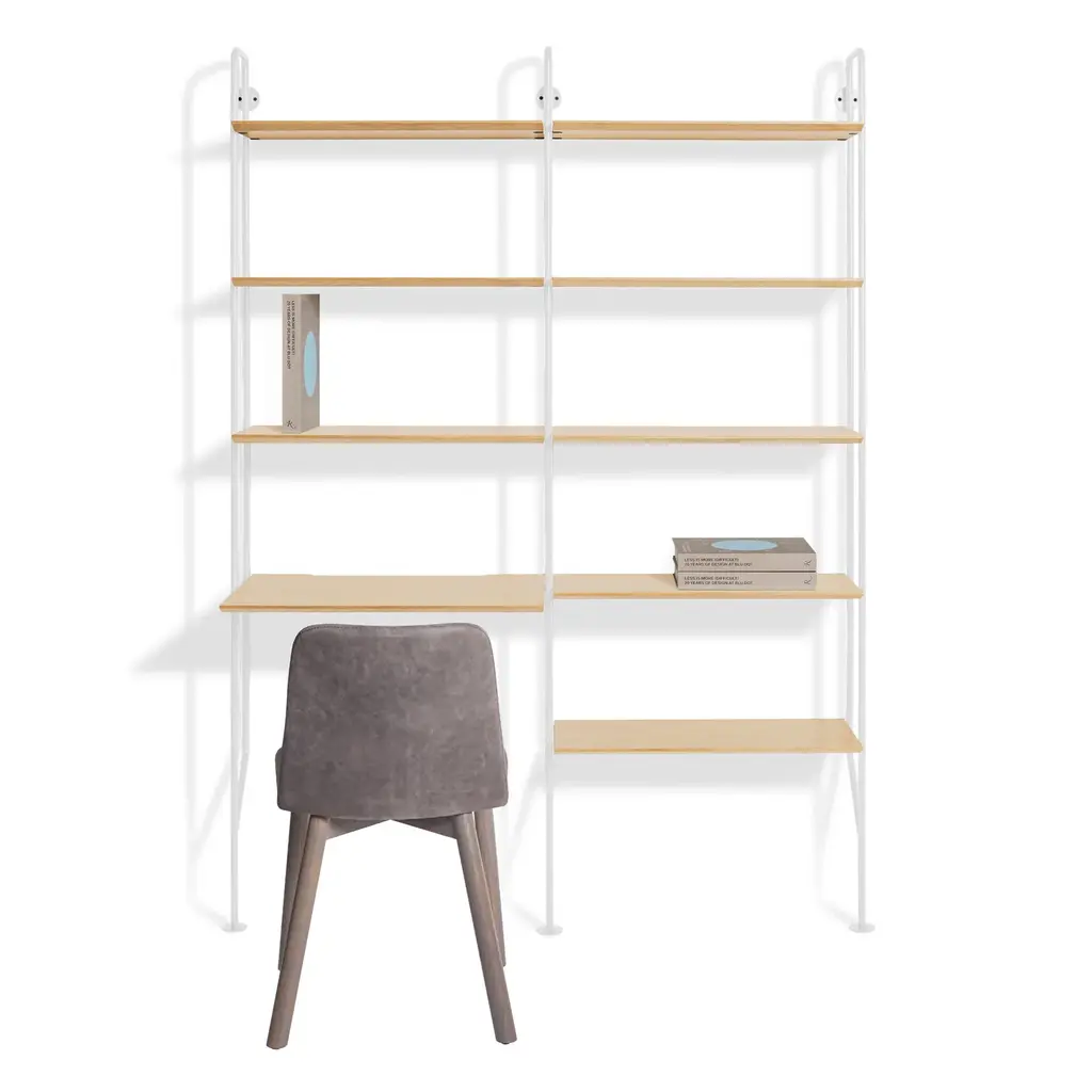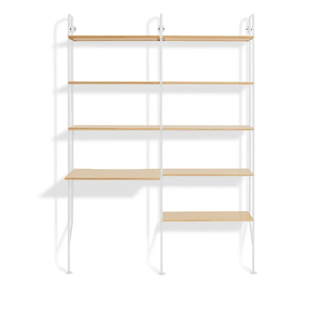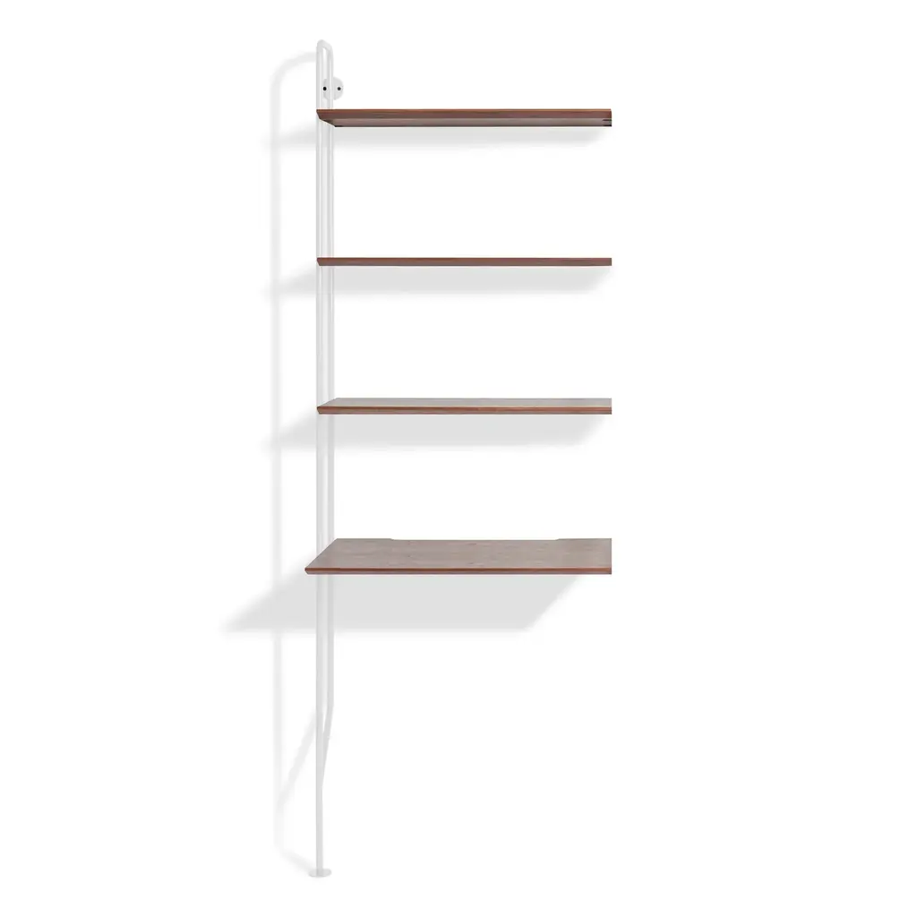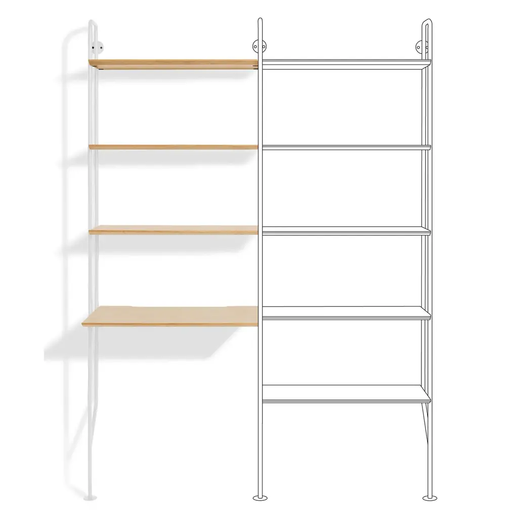 Powder-coated steel uprights and wood shelves in multiple finish options make you the master of your own book case destiny. We added a desk with the perfect work surface for even more choices. Single units stand alone. Gang up multiples to create mass appeal.Please note: The Hitch Add-on unit requires attachment to a Hitch Bookcase. Shown with one Hitch Bookcase and one Add-on unit.