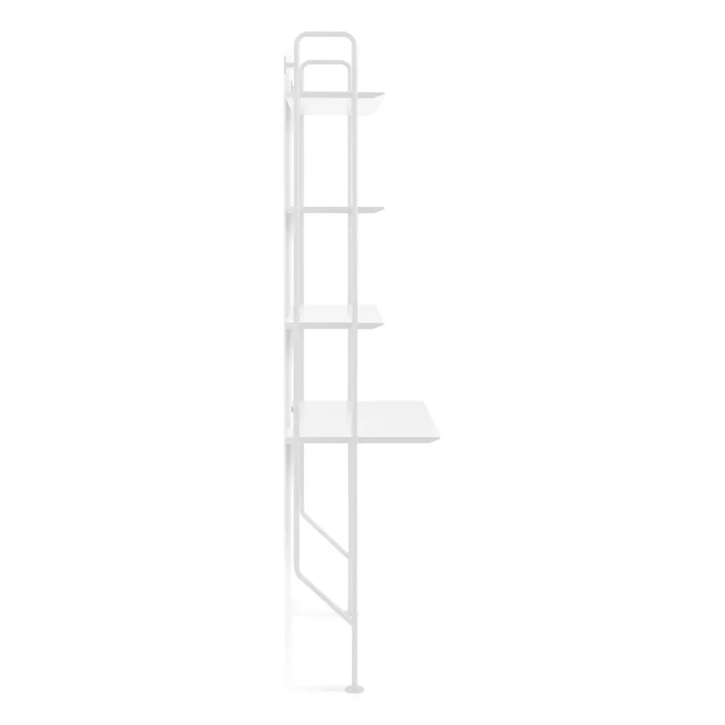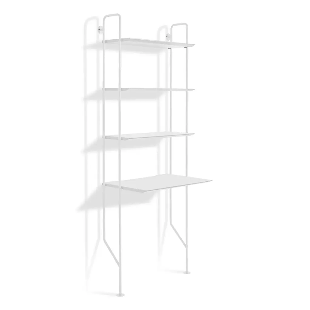 Powder-coated steel uprights and wood shelves in multiple finish options make you the master of your own book case destiny. We added a desk with the perfect work surface for even more choices. Single units stand alone. Gang up multiples to create mass appeal.