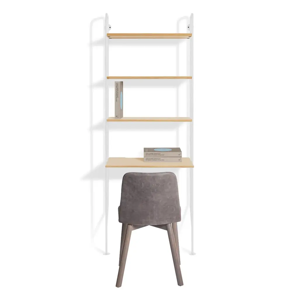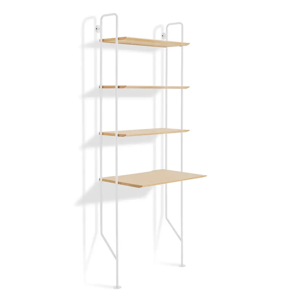 Powder-coated steel uprights and wood shelves in multiple finish options make you the master of your own book case destiny. We added a desk with the perfect work surface for even more choices. Single units stand alone. Gang up multiples to create mass appeal.