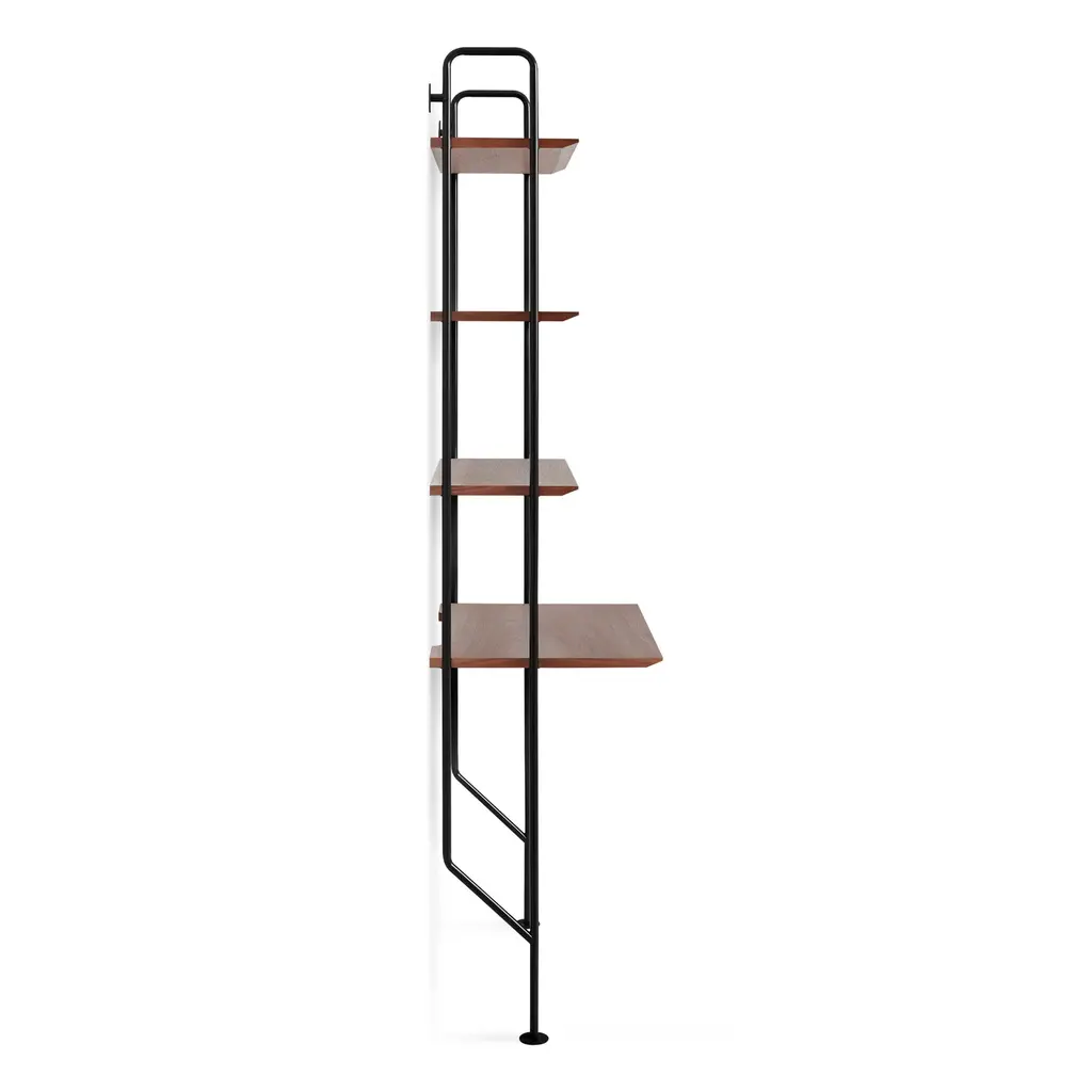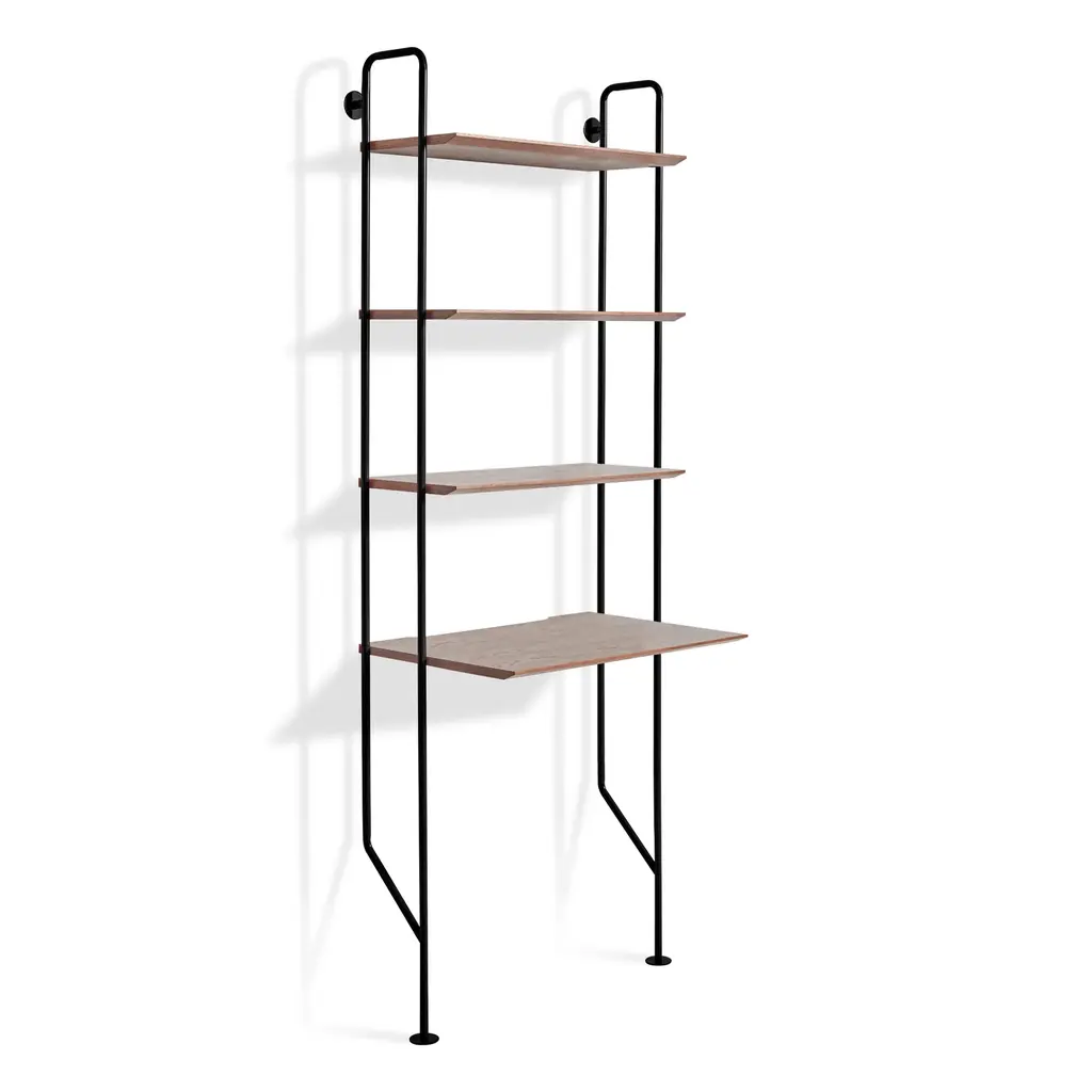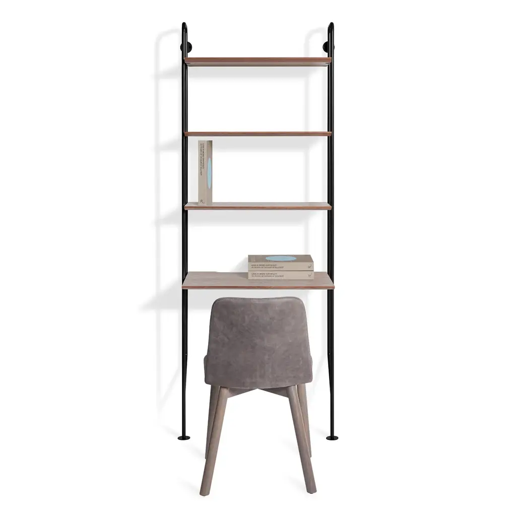 Powder-coated steel uprights and wood shelves in multiple finish options make you the master of your own book case destiny. We added a desk with the perfect work surface for even more choices. Single units stand alone. Gang up multiples to create mass appeal.