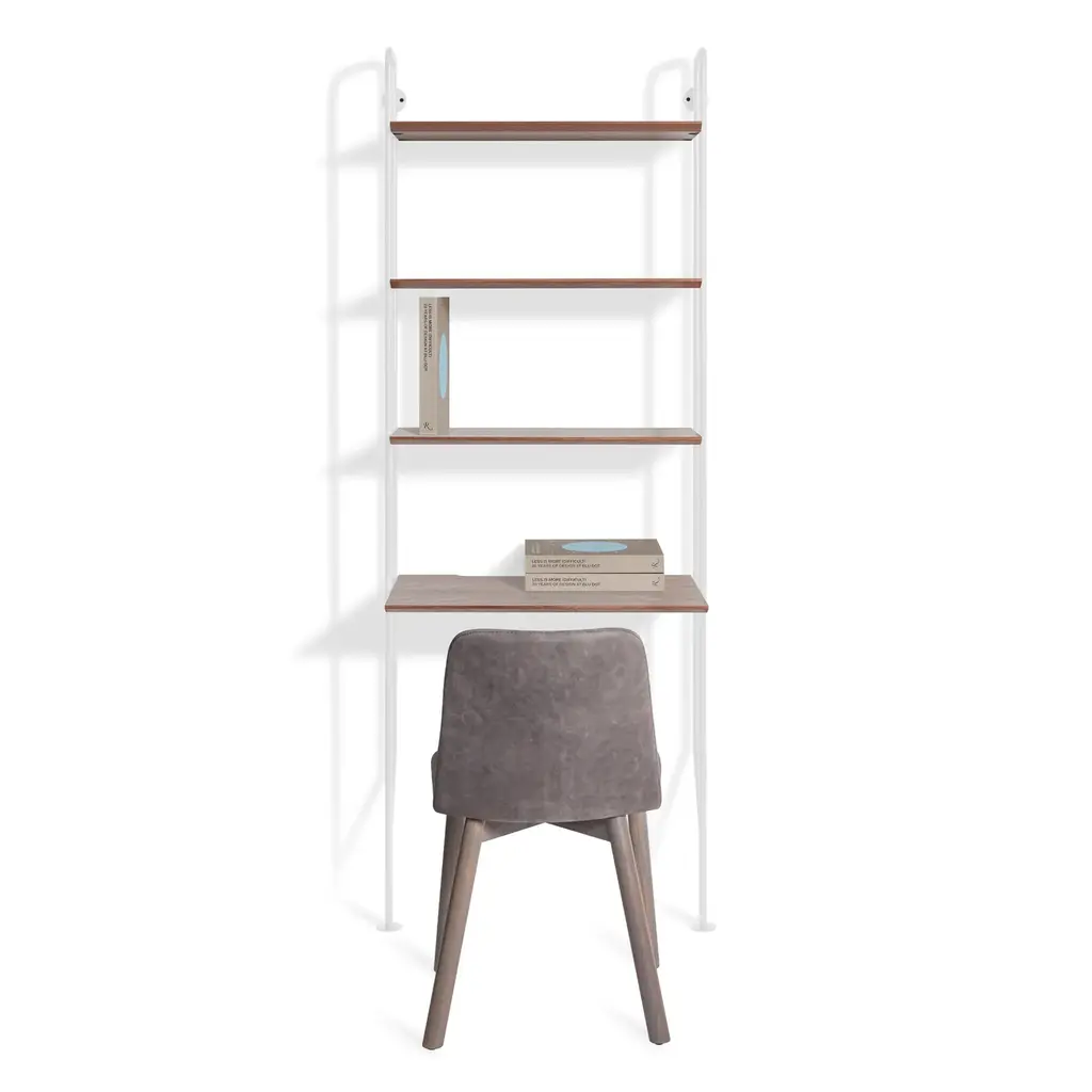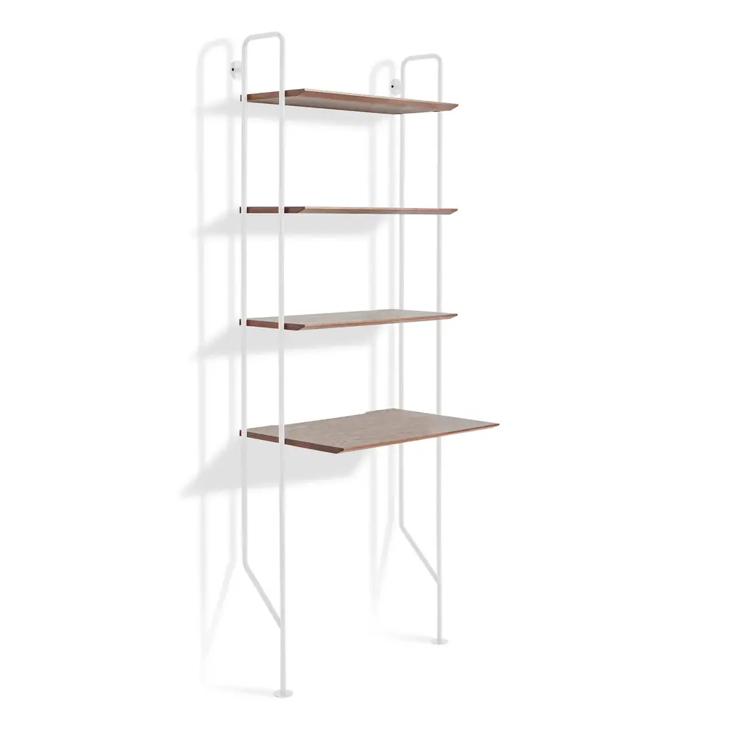 Powder-coated steel uprights and wood shelves in multiple finish options make you the master of your own book case destiny. We added a desk with the perfect work surface for even more choices. Single units stand alone. Gang up multiples to create mass appeal.