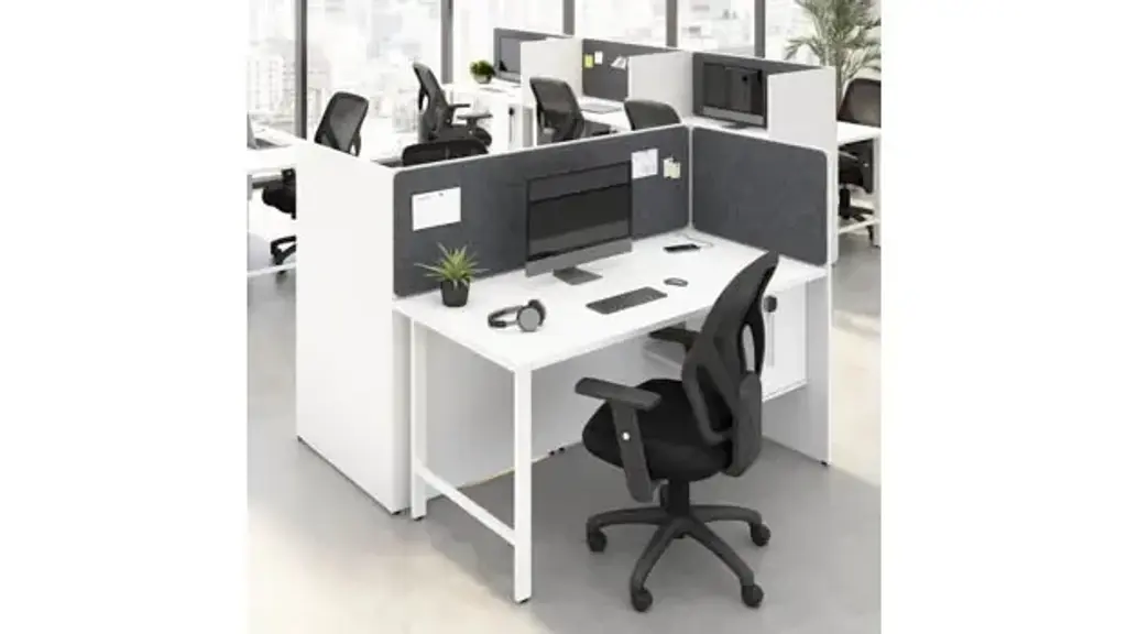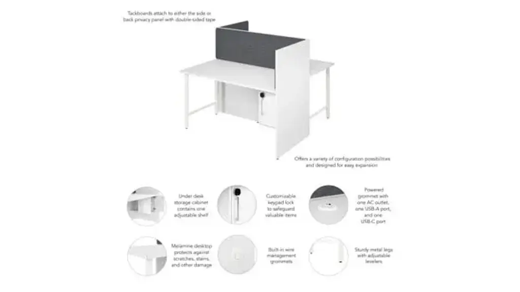 The Bush Business Furniture Hustle 60-inch 2 Person Office Cubicles with Locking Storage and Large Tackboards instantly turn any space into a private and productive work area. Dual workstations with robust 1-inch-thick desktops accommodate multiple monitors and other equipment with 200-pound weight capacities. The work surfaces feature a durable melamine finish that protects against scratches, stains, and other cosmetic damage to preserve the computer desks' appearance throughout years of regular use. Under desk storage cabinets with customizable keypad locks securely store valuables and personal items. The built-in cabinets' interiors each have one adjustable shelf to hold materials of various shapes and sizes. Desktop power grommets with AC outlets, USB-A, and USB-C ports make charging and connecting electronic devices easy while wire management pass throughs keep the work areas free from pesky cords and cables. Large tackboards attach to each back panel with double-sided tape to provide an ideal place to display memos and reminders or give cubicles a personal touch with pictures and decorations. This two person cubicle desk set has been meticulously designed and tested to meet or exceed ANSI/BIFMA quality standards for safety and performance. See the full Hustle Collection to complete your workspace with high-quality office furniture at an affordable price. Overal Dimensions: 59.37" x 30.39" D x 48.19" H. Ships ready for easy assembly.