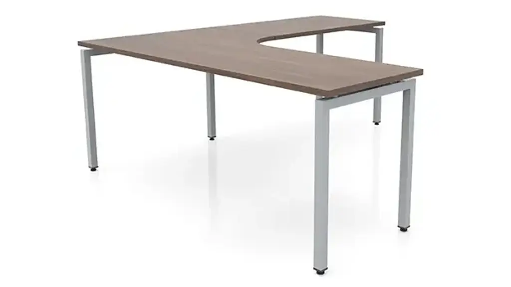 OnTask L Shaped Curved Corner Desk offers a wonderful mixed material look that can be used in any work environment. Laminate top is 1" thick and is supported by the OnTask metal legs. Available in several laminate finishes and 2 metal colors. Curved inside corner allows user to comfortably pull up and work into the corner of the desk. Desk is not reversible and must be ordered in left or right return configuration. Includes punched metal modesty panel. Ships ready for easy assembly.