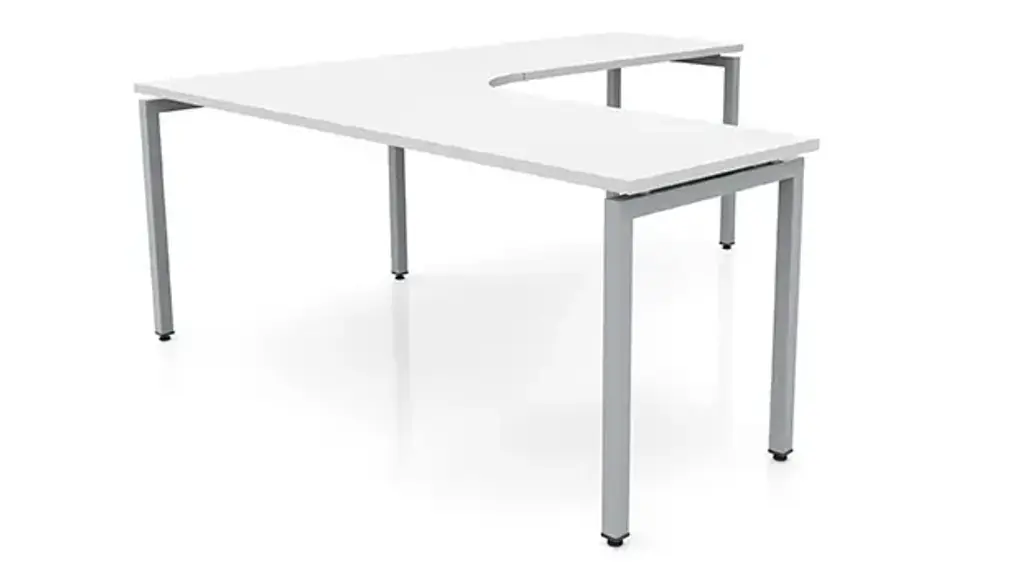 OnTask L Shaped Curved Corner Desk offers a wonderful mixed material look that can be used in any work environment. Laminate top is 1" thick and is supported by the OnTask metal legs. Available in several laminate finishes and 2 metal colors. Curved inside corner allows user to comfortably pull up and work into the corner of the desk. Desk is not reversible and must be ordered in left or right return configuration. Includes punched metal modesty panel. Ships ready for easy assembly.