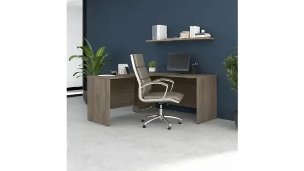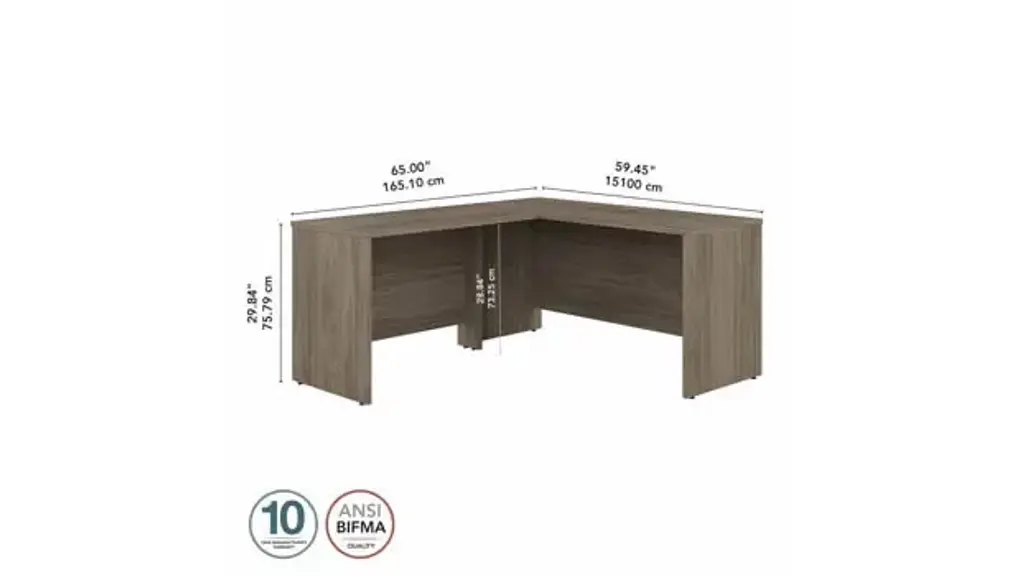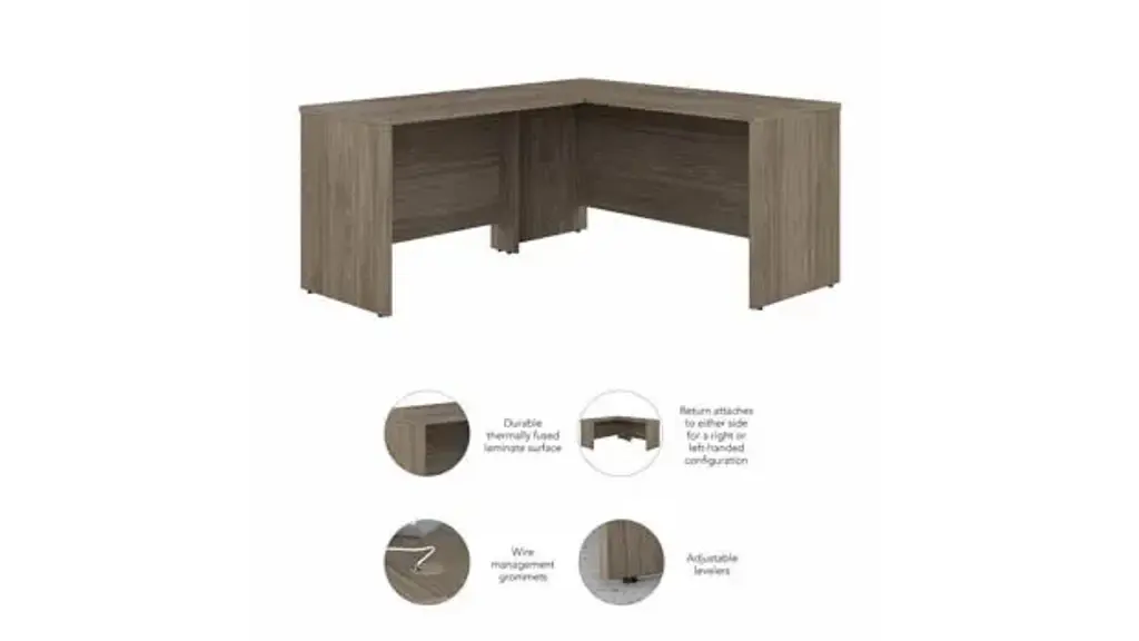 This Desk is Reversible Highlighted by its contemporary style and commercial quality design, the Bush Business Furniture Studio C 60" W L-Shaped Desk with 42" W Return presents an ideal workspace for the modern professional. Take advantage of the spacious corner desk surface to spread out with a computer, paperwork and more as you tackle your next big project. The L-shaped desktop easily accommodates multiple monitors and other materials with a 200 lb. weight capacity and built-in wire management grommets. Position the L-Desk in a corner to save space in a small private office, or make use of the finished back to face outward in an open-plan environment. The Return can be installed on either side of the main work surface for a right or left-handed configuration, giving this L-Shaped Computer Desk the ability to adapt to virtually any office layout. The Studio C Collection offers an array of coordinating storage products to complete your workspace, including convenient 2 and 3 Drawer Mobile File Cabinets (sold separately) that fit underneath the desktop for easy access to documents and supplies. A variety of attractive finish options give you plenty of freedom to choose the perfect look for your business or organization. This commercial office desk is tested to meet ANSI/BIFMA quality standards for safety and performance. American made with U.S. and imported parts. Overall Dimensions: 59.45" W x 65" D x 29.84" H. Ships ready for easy assembly.