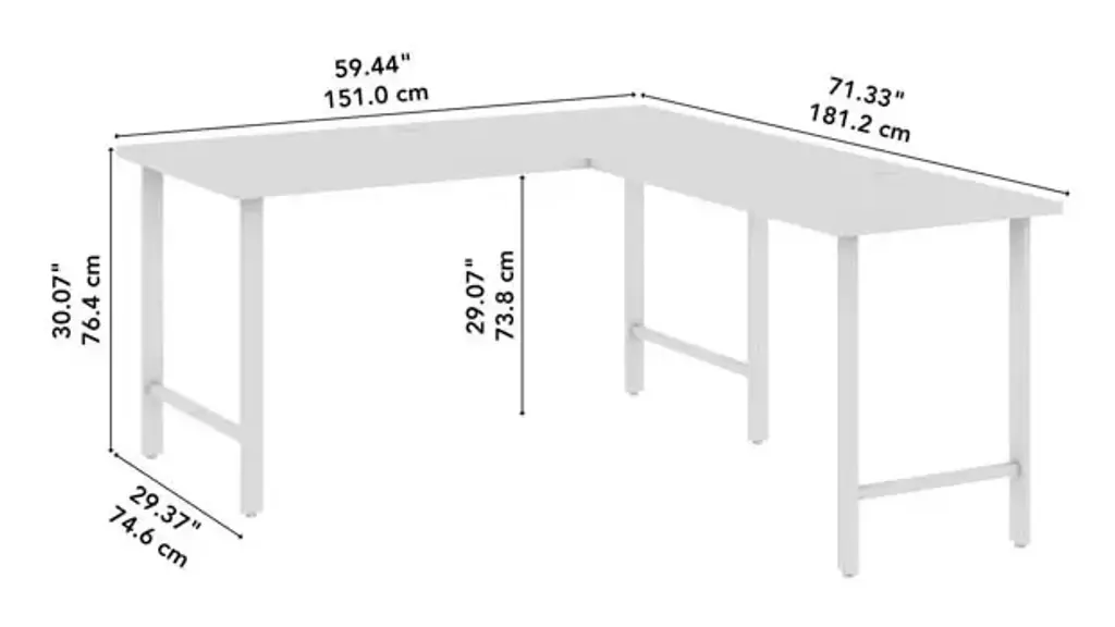 The Bush Business Furniture Hustle 60" W x 30" D L-Shaped Computer Desk with Metal Legs provides the form and function needed to support your entrepreneurial spirit without breaking the bank. An ideal choice for small to medium-size businesses and home offices alike, each modern desk includes a bracket that allows for workstations to connect as your needs evolve and expand. Spread out with materials and equipment on a durable work surface with built-in wire management and a weight capacity of 200 lbs. The L-shaped office desk's thermally fused laminate finish fends off scratches, stains, and other cosmetic damage that occurs from daily use in a busy professional environment. Coordinating items in the Hustle Collection include a mobile filing cabinet, lateral file cabinet, storage cabinet and 5 shelf bookcase (sold separately) to keep work materials and office supplies in order. Find the perfect look for your workspace with an array of attractive finish options. This corner desk has been meticulously designed and tested to meet or exceed ANSI/BIFMA quality standards for safety, durability, and performance. American made with U.S. and imported parts. Overall Dimensions: 59.44" W x 71.33" D x 30.07" H. Ships ready for easy assembly.