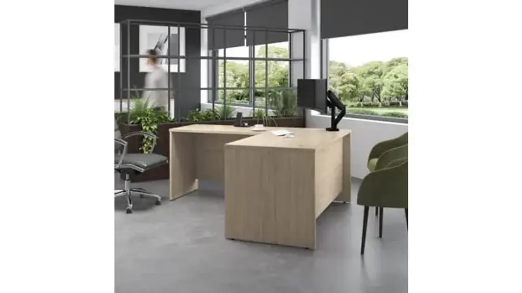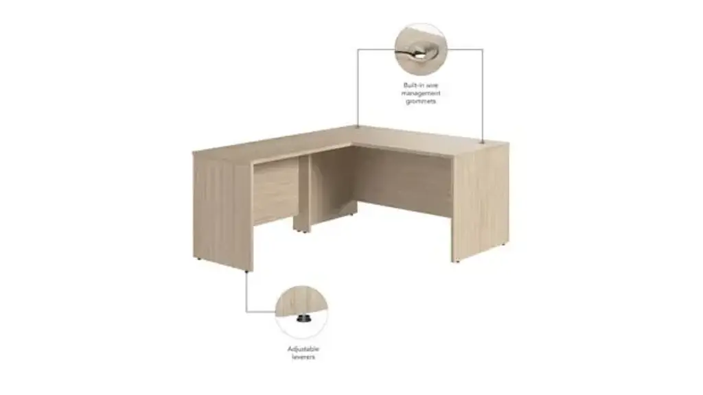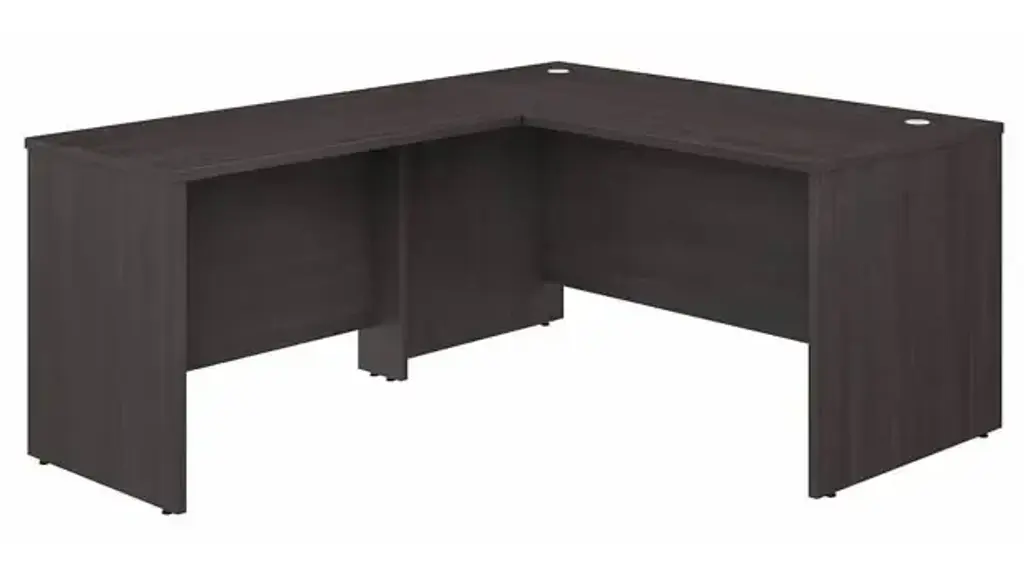 This Desk is Reversible Highlighted by its contemporary style and commercial quality design, the Bush Business Furniture Studio C 60" W L-Shaped Desk with 42" W Return presents an ideal workspace for the modern professional. Take advantage of the spacious corner desk surface to spread out with a computer, paperwork and more as you tackle your next big project. The L-shaped desktop easily accommodates multiple monitors and other materials with a 200 lbs. weight capacity and built-in wire management grommets. Position the L-Desk in a corner to save space in a small private office, or make use of the finished back to face outward in an open-plan environment. The Return can be installed on either side of the main work surface for a right or left-handed configuration, giving this L-Shaped Computer Desk the ability to adapt to virtually any office layout. The Studio C Collection offers an array of coordinating storage products to complete your workspace, including convenient 2 and 3 Drawer Mobile File Cabinets (sold separately) that fit underneath the desktop for easy access to documents and supplies. Six attractive finish options give you plenty of freedom to choose the perfect look for your business or organization. This commercial office desk is tested to meet ANSI/BIFMA quality standards for safety and performance. American made with U.S. and imported parts. Overall Dimensions: 59.45" W x 71.02" D x 29.84" H. Ships ready for easy assembly.