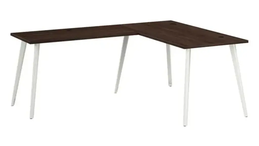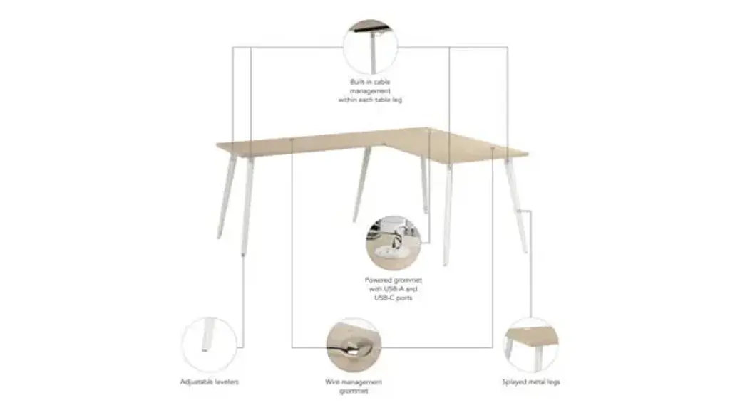 This Desk is Reversible The Bush Business Furniture Vista 60" W x 30" D L-Shaped Desk with Splayed Metal Legs offers a practical, long-lasting workspace ideal for open area offices. Its durable 1-inch thick thermally fused laminate surface resists scratches, stains, and other cosmetic damage while supporting up to 200 pounds. Desk Return attaches to computer desk to form a right or left-handed L-Shaped Desk. Splayed metal legs provide a sleek look with built-in cable management, keeping cords routed to the floor for a clutter-free space. Designed for maximum stability, the desk includes adjustable levelers to compensate for uneven flooring and optional wall anchors for added security. Sturdy L-Shaped Computer Desk offers plenty of room to spread out while working on your next project or assignment. Desktop includes one built-in wire management grommet to keep cords and cables out of the way and one powered grommet to keep devices charged with a standard outlet as well as USB-A and USB-C ports. Available in several contemporary finishes, and you can complete your office with a coordinating Vista Cabinet, Bookcase, or 48" W Desk Return (sold separately). Bush Business Furniture's commitment to safety includes rigorous testing that meets or exceeds ANSI/BIFMA x5.5 commercial test standards. Made in North America with globally sourced materials. Overall Dimenions: 59.69" W x 76.97" D x 29.95" H. Ships ready for easy assembly.