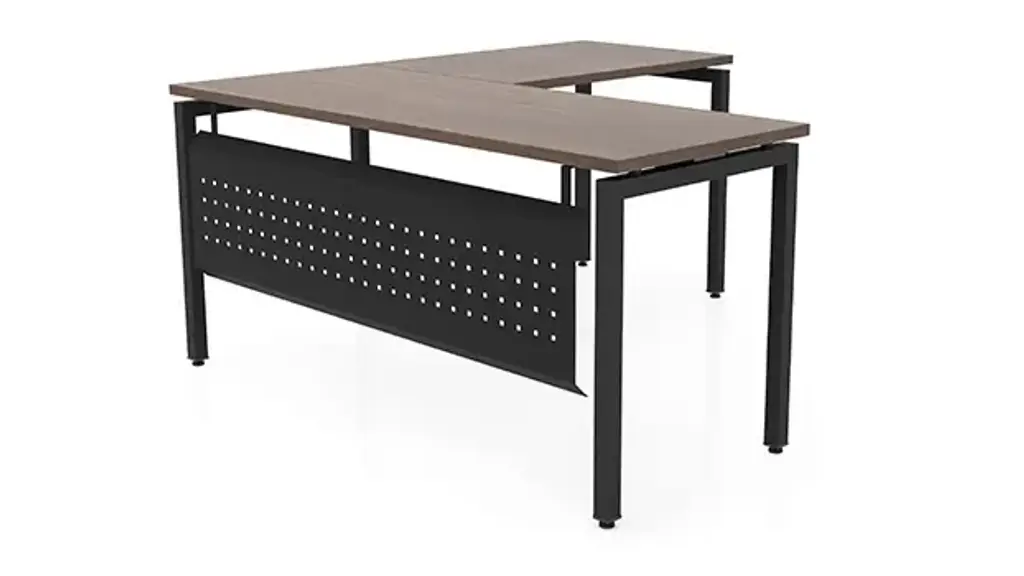 This Desk is Reversible OnTask Slender L Shaped Desk offers a wonderful mixed material look that can be used in any work environment. Slender because the work surface is 24"D on both the desk and the return. Laminate top is 1" thick and is supported by the OnTask metal legs. Available in several laminate finishes and 2 metal colors. Includes a punched metal modesty panel. Ships ready for easy assembly.