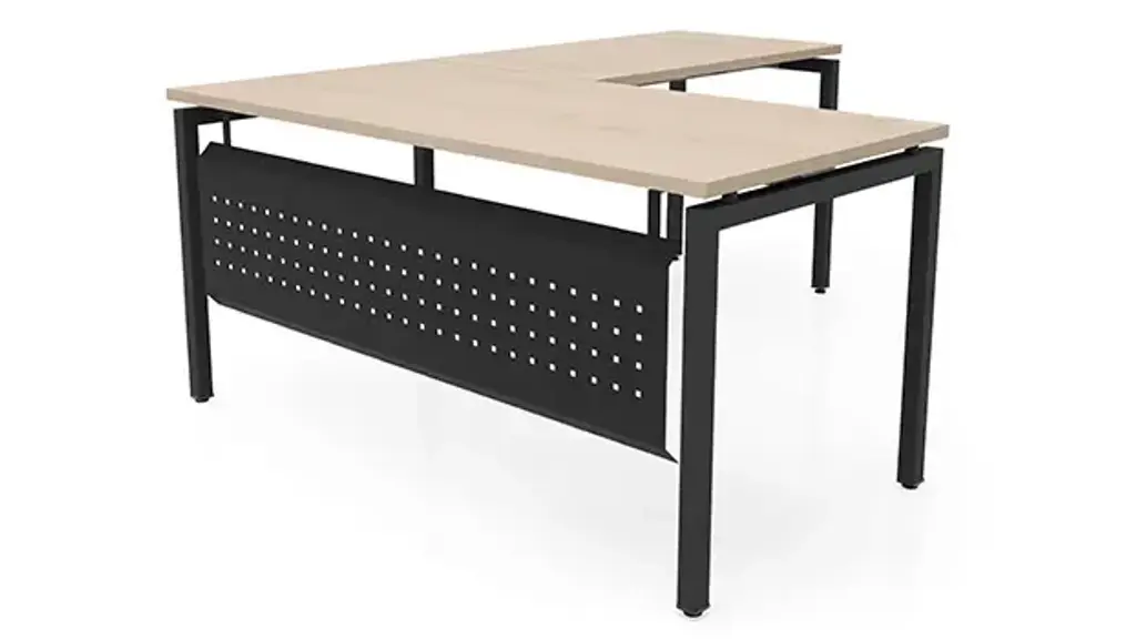 This Desk is Reversible OnTask L Shaped Desk offers a wonderful mixed material look that can be used in any work environment. Laminate top is 1" thick and is supported by the OnTask metal legs. Available in several laminate finishes and 2 metal colors. Includes punched metal modesty panel. Ships ready for easy assembly.