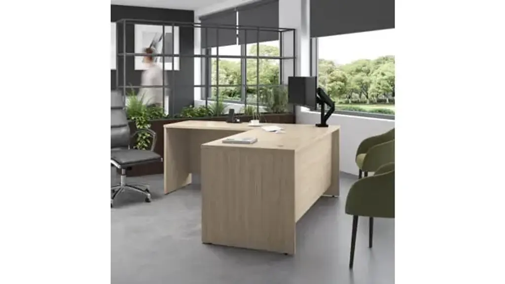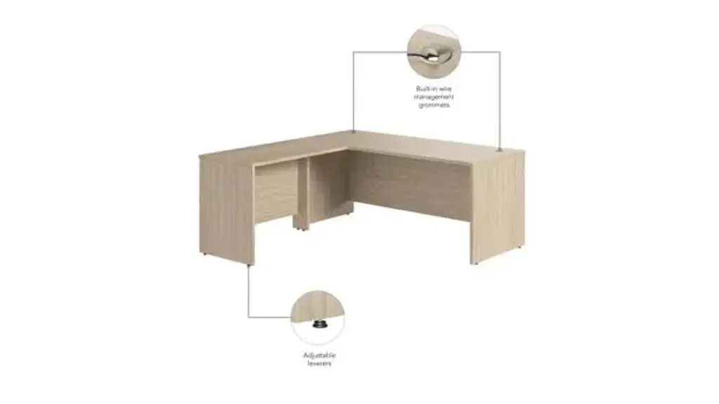 This Desk is Reversible Highlighted by its contemporary style and commercial quality design, the Bush Business Furniture Studio C 72" W L-Shaped Desk with 42" W Return presents an ideal workspace for the modern professional. Take advantage of the spacious corner desk surface to spread out with a computer, paperwork and more as you tackle your next big project. The L-shaped desktop easily accommodates multiple monitors and other materials with a 200 lbs. weight capacity and built-in wire management grommets. Position the L-Desk in a corner to save space in a small private office, or make use of the finished back to face outward in an open-plan environment. The Return can be installed on either side of the main work surface for a right or left-handed configuration, giving this L-Shaped Computer Desk the ability to adapt to virtually any office layout. The Studio C Collection offers an array of coordinating storage products to complete your workspace, including convenient 2 and 3 Drawer Mobile File Cabinets (sold separately) that fit underneath the desktop for easy access to documents and supplies. Six attractive finish options give you plenty of freedom to choose the perfect look for your business or organization. This commercial office desk is tested to meet ANSI/BIFMA quality standards for safety and performance. American made with U.S. and imported parts. Overall Dimensions: 71.02" W x 71.02" D x 29.84" H. Ships ready for easy assembly.