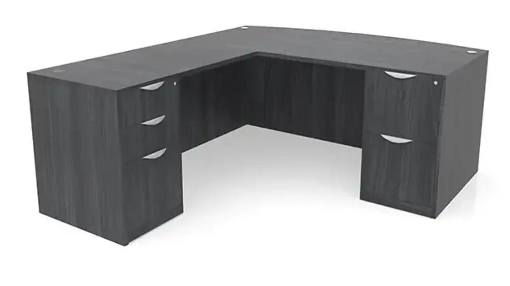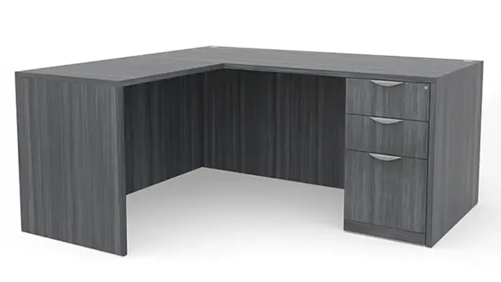 Durable laminate finish. Impact resistant edge protection. L-desk is fully reversible. Desk Shell Only - Pedestals Sold Separately. Ships ready for easy assembly.