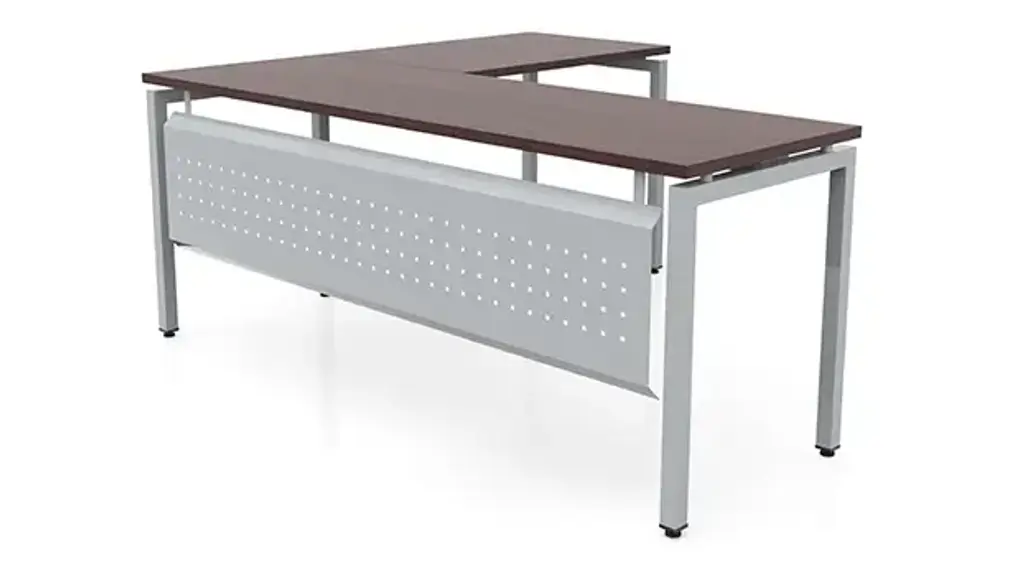 This Desk is Reversible OnTask Slender L-Shaped Desk offers a wonderful mixed material look that can be used in any work environment. Slender because the work surface is 24"D on both the desk and the return. Laminate top is 1" thick and is supported by the OnTask metal legs. Available in several laminate finishes and 2 metal colors. Includes a punched metal modesty panel. Ships ready for easy assembly.
