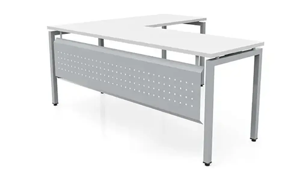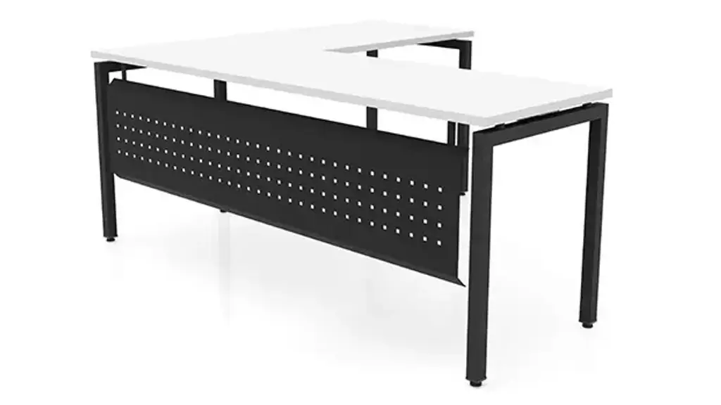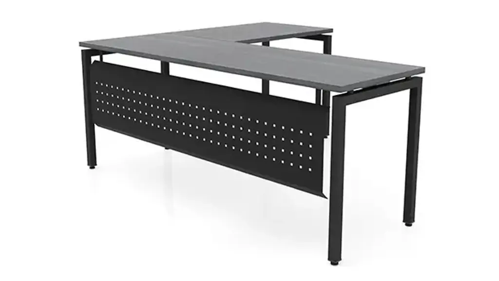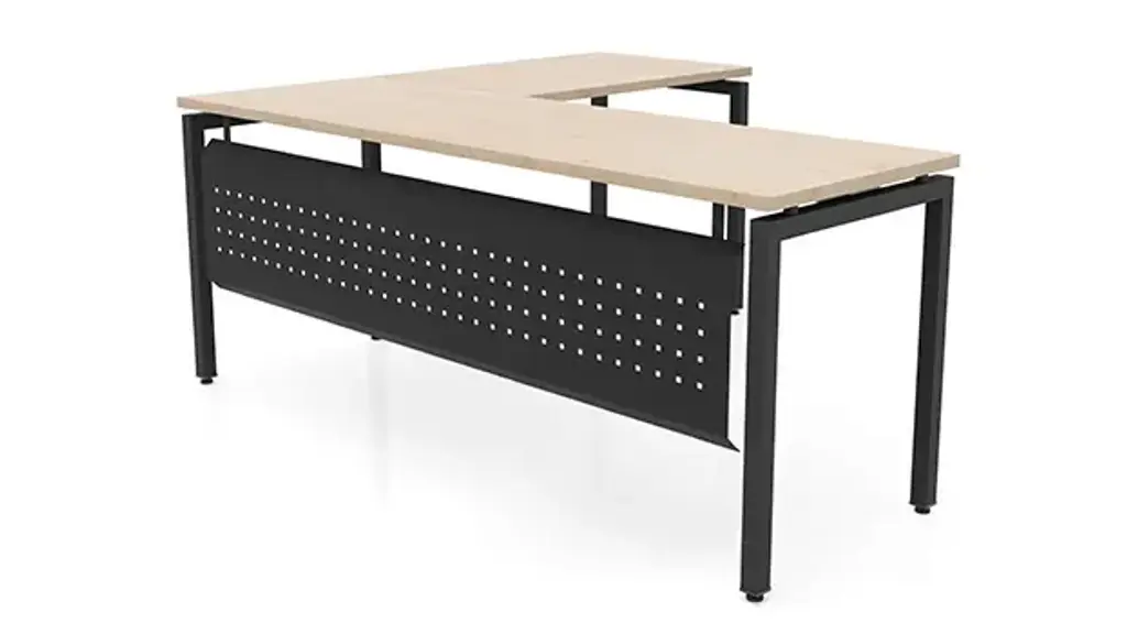 This Desk is Reversible OnTask Slender L-Shaped Desk offers a wonderful mixed material look that can be used in any work environment. Slender because the work surface is 24"D on both the desk and the return. Laminate top is 1" thick and is supported by the OnTask metal legs. Available in several laminate finishes and 2 metal colors. Includes a punched metal modesty panel. Ships ready for easy assembly.