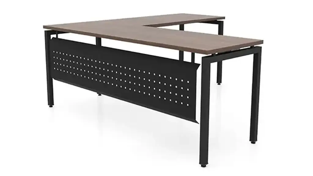 This Desk is Reversible OnTask Slender L-Shaped Desk offers a wonderful mixed material look that can be used in any work environment. Slender because the work surface is 24"D on both the desk and the return.  Laminate top is 1" thick and is supported by the OnTask metal legs. Available in several laminate finishes and 2 metal colors. Includes a punched metal modesty panel. Ships ready for easy assembly.