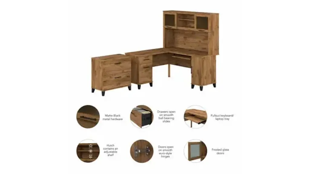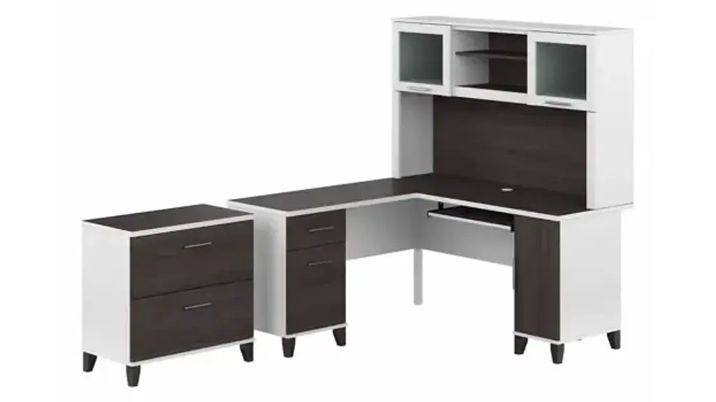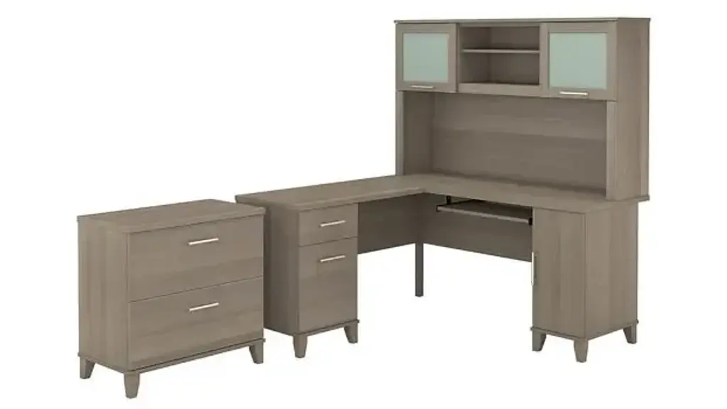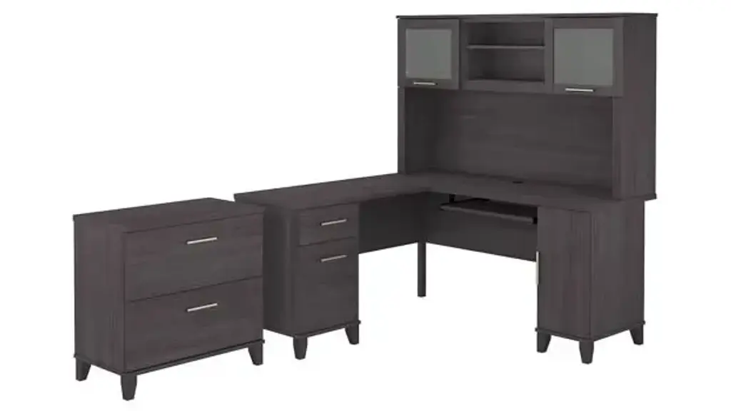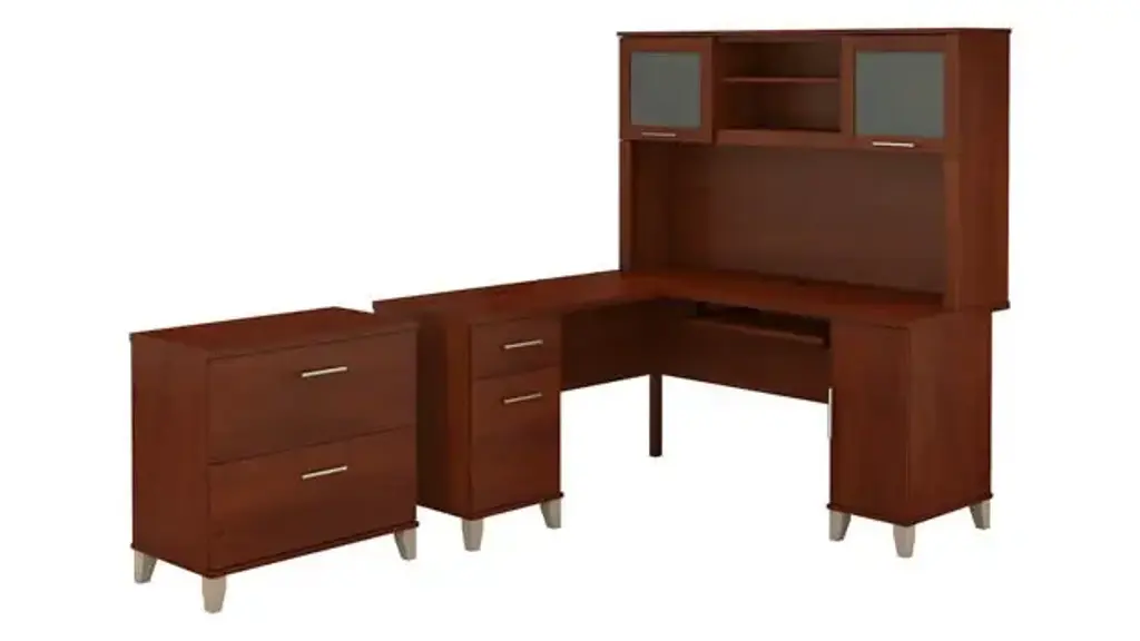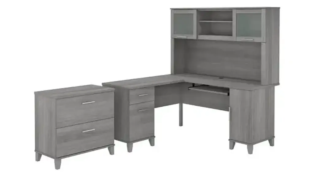 This Desk is Reversible Build your ideal home office around the stylish and functional Bush Furniture Somerset 60"W L-Shaped Desk with Hutch and Lateral File Cabinet. This small office set features all the storage and versatility needed to create a practical, modern workstation. The expansive 60"W surface with wire management offers ample room to spread out and complete large projects. A convenient pull-out shelf provides a perfect place to keep a keyboard or laptop. A vertical storage cabinet with an adjustable shelf and a box drawer offer plenty of storage for office supplies and utensils and a file drawer accommodates letter size documents. The Hutch has a large open compartment for books, binders or decorations and two lift-up frosted glass doors for concealed storage. The Lateral File Cabinet utilizes smooth ball bearing slides for easy access to legal and letter size documents, even those all the way in the back. Two drawers are interlocking to reduce the likelihood of tipping, making the filing cabinet a safe and family-friendly storage solution. Transitional styling includes your choice of stylish finishes with tapered leg accents and contemporary metal hardware for an alluring appearance. This quality furniture is tested to meet ANSI/SOHO standards for safety and performance. Overall Dimensions: 59.16"W x 59.16"D x 6.84"H. Ships ready for easy assembly.