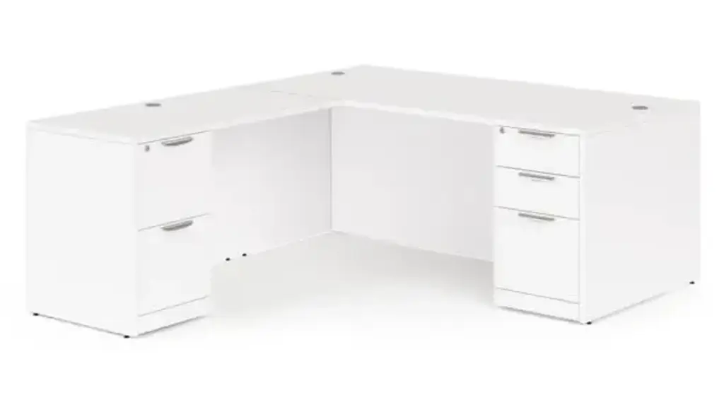 The Potenza Series propose a unique versatile design. Our low glared thermofused laminate offers a rich wood look & feel. The matching 3mm PVC edge offers comfort & protection. L Shaped Desk includes a box/box/file pedestal and a file/file pedestal. Four door hutch for storage. Main Desk measures 72"W x 24"D x 29"H. Angled Return measures 42"W x 20"/24"D x 29"H. Overall dimensions are 72"W x 66"D x 29"H. Ships ready for easy assembly.
