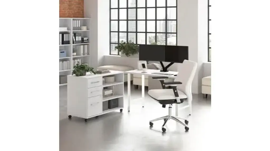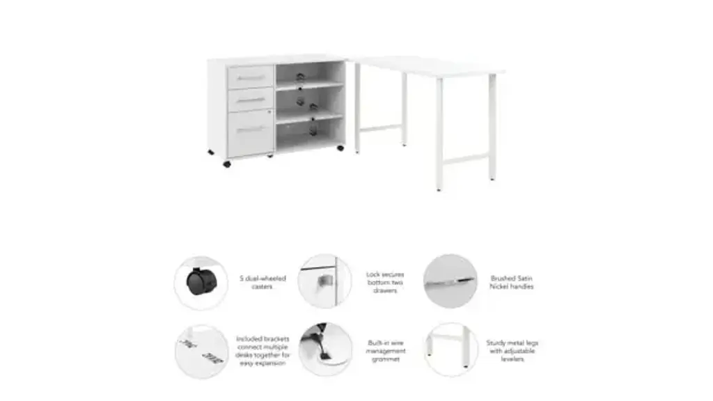 The Bush Business Furniture Hustle 48" W x 24" D Computer Desk and Storage Cabinet with Drawers and Shelves provides the form and function needed to support your entrepreneurial spirit without breaking the bank. An ideal choice for small to medium-size businesses and home offices alike, each modern desk includes a bracket that allows for workstations to connect as your needs evolve and expand. Spread out with materials and equipment on a durable work surface with built-in wire management and a weight capacity of 200 pounds. The small office desk's thermally fused laminate finish fends off scratches, stains, and other cosmetic damage that occurs from daily use in a busy professional environment. The small cabinet rolls effortlessly throughout your workspace to provide storage where it's needed most. Its left side features three drawers: one file drawer for letter, legal, and A4-size paperwork and two box drawers to organize small office supplies. Drawers can be locked to safeguard documents with sensitive information as well as valuable items. The office cabinet's open storage area includes two adjustable shelves to accommodate work materials and equipment of various sizes. This computer table desk with storage has been meticulously designed and tested to meet or exceed ANSI/BIFMA quality standards for safety, durability, and performance. American made with U.S. and imported parts. Overall Dimensions: 47.60" W x 23.34" D x 30.07" H. Ships ready for easy assembly.