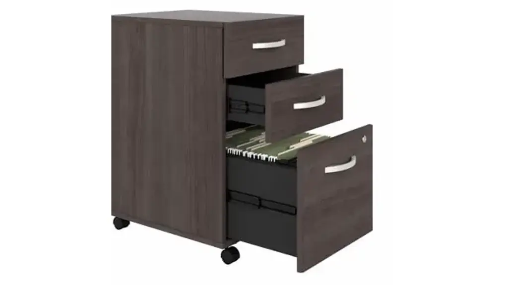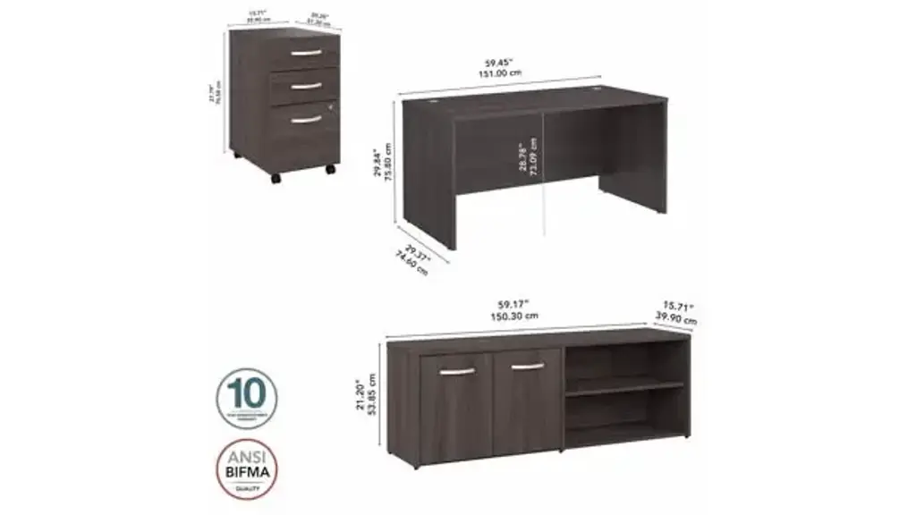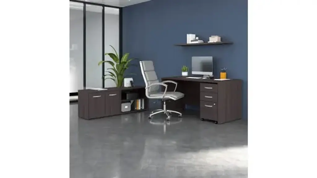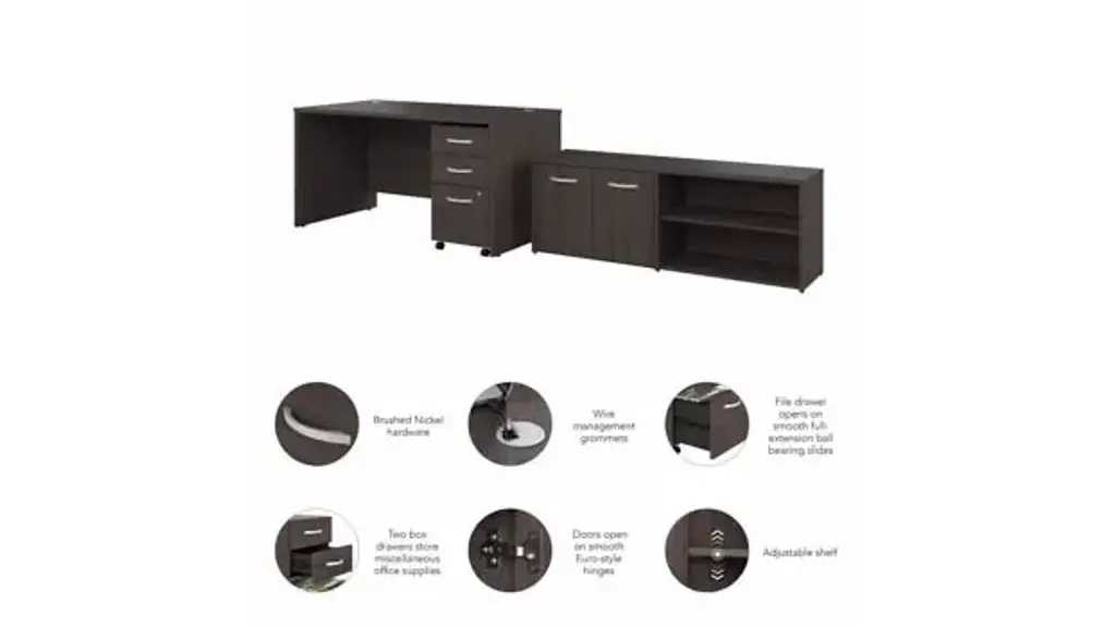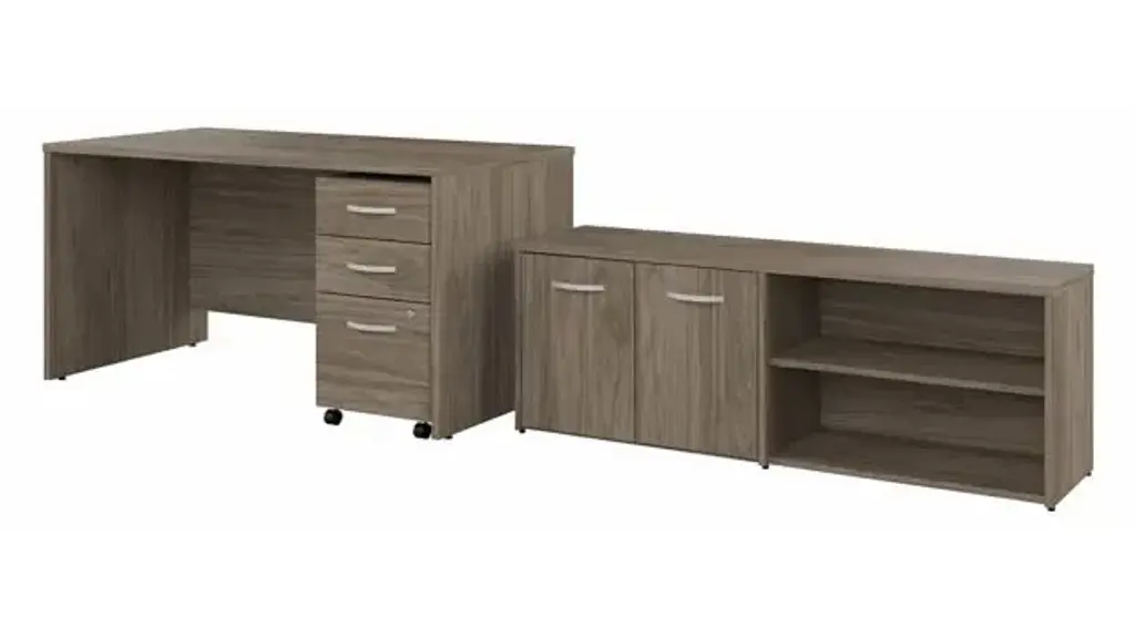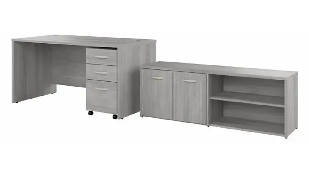 The Bush Business Furniture Studio C 60" W x 30" D Office Desk with Storage Return and Mobile File Cabinet offers a stylish, long-lasting workspace solution for today's professionals. Tackle your next project or assignment with a computer, books and more on a desktop that supports up to 200 lbs. A built-in wire management grommet keeps cords and cables in order, so your work area remains free from unnecessary clutter. The computer desk is finished on all sides, allowing it to look great facing any direction in a home or professional office. The filing cabinet's bottom drawer accepts letter, legal and A4-size paperwork while a pair of box drawers organize supplies. The two bottom drawers can be locked to protect sensitive files and personal items. The storage credenza's open and closed compartments each include one fixed and one adjustable shelf to accommodate everything from reference materials to plants, pictures and decorations. Each shelf supports up to 50 lbs., so storing larger items is no problem. Find the perfect look for your space with a variety of contemporary and traditional finish options. This modern desk with drawers and shelves has been meticulously tested to meet or exceed ANSI/BIFMA quality standards for safety, durability and performance. See the full Studio C Collection for coordinating items to complete your workspace. American made with U.S. and imported parts. Overall Dimensions: 59.45" W x 29.37" D x 29.84" H. Desk Dimensions: 59.45" W x 29.37" D x 29.84" H. Storage Return Dimensions: 59.17" W x 15.71" D x 21.20" H. Mobile File Cabinet Dimensions: 15.71" W x 20.20" D x 27.79" H. Ships ready for easy assembly. Mobile Cabinet is shipped fully assembled.