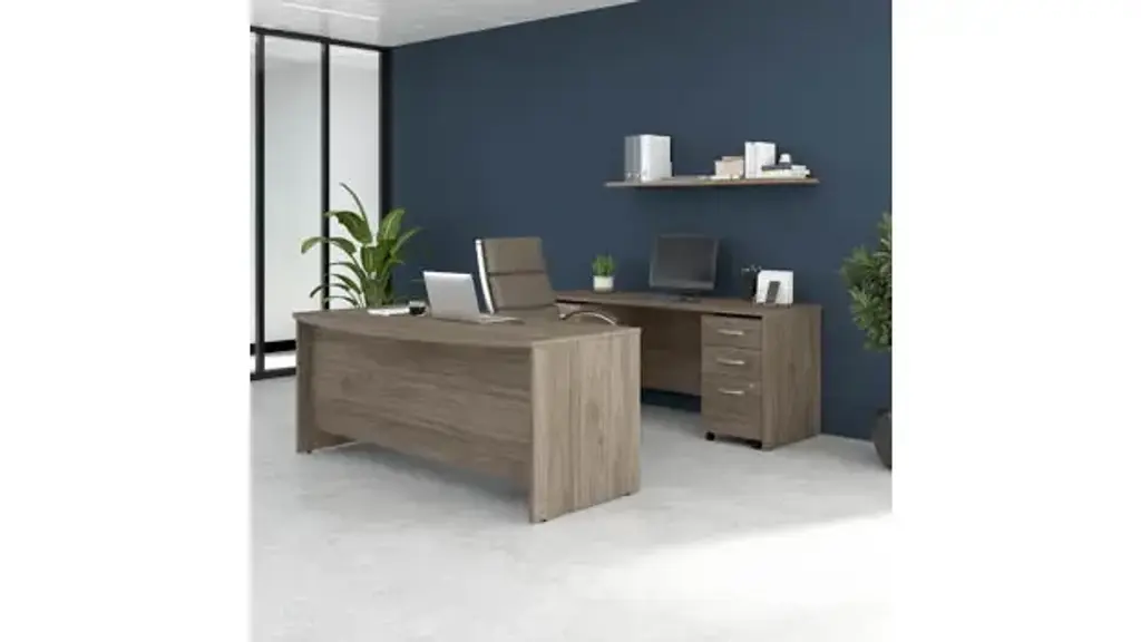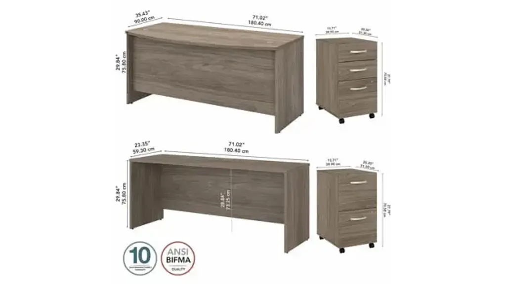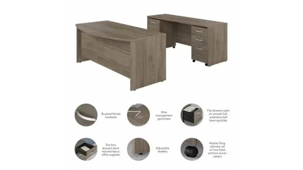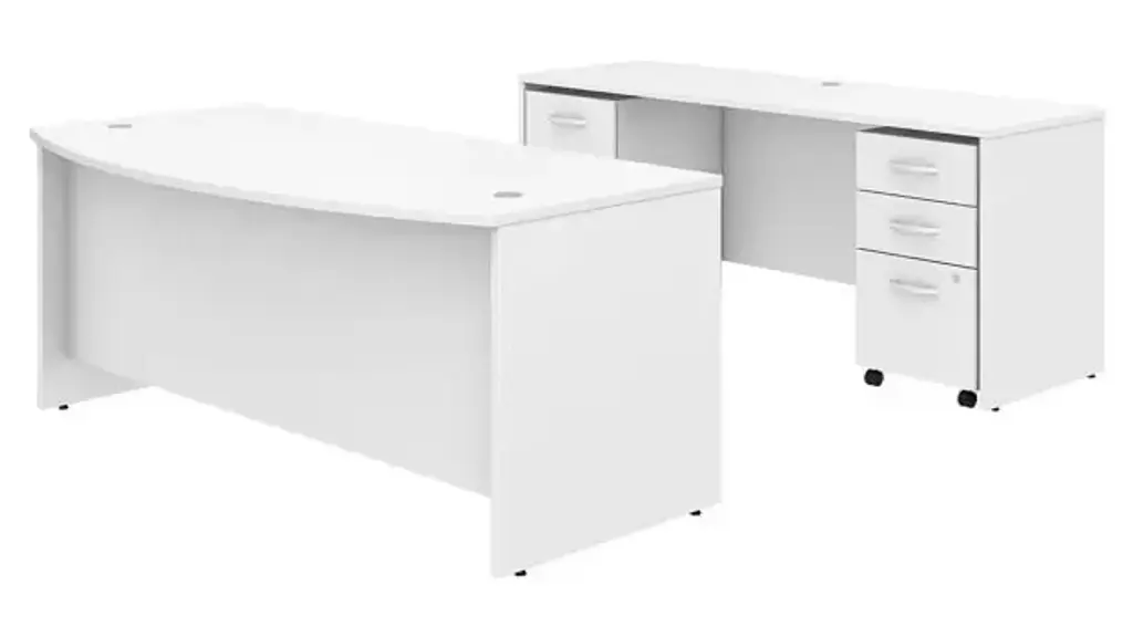 This Desk is Reversible Give your office the workspace you need and the style you deserve with the Bush Business Furniture Studio C 72"W Bow Front Desk, Credenza and 2 Assembled Mobile File Cabinets. The extended Bow Front Desk surface offers extra space to spread out with a computer and more while giving guests a rounded front to pull up a chair and collaborate. With a thermally fused laminate finish, the office furniture set stands up to years of everyday use. The popular, classic desk design receives a contemporary update with trendy finish options to fit seamlessly in a private office or as part of a larger environment. Keep pesky computer cords out of your way with the cable management system for an organized Bow Front Desk work surface. Make room to spread out and work on a variety of projects on the 72"W Credenza Desk while storing your paperwork in the Mobile File Cabinets. For your letter, legal and A4 size files along with office supplies, the contemporary cabinets roll anywhere or remain in place as needed. File drawers open on smooth full-extension ball bearing slides for an easy reach to papers in the back. Meets ANSI/BIFMA quality test standards for performance and safety. American made with U.S. and imported parts.   Ships ready for easy assembly, File Cabinets ship fully assembled.