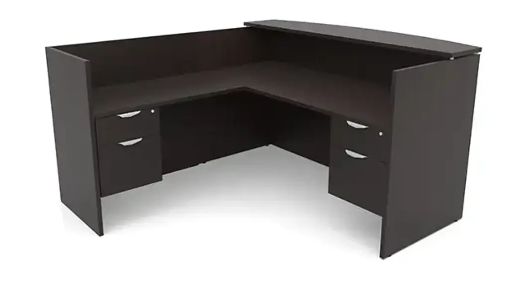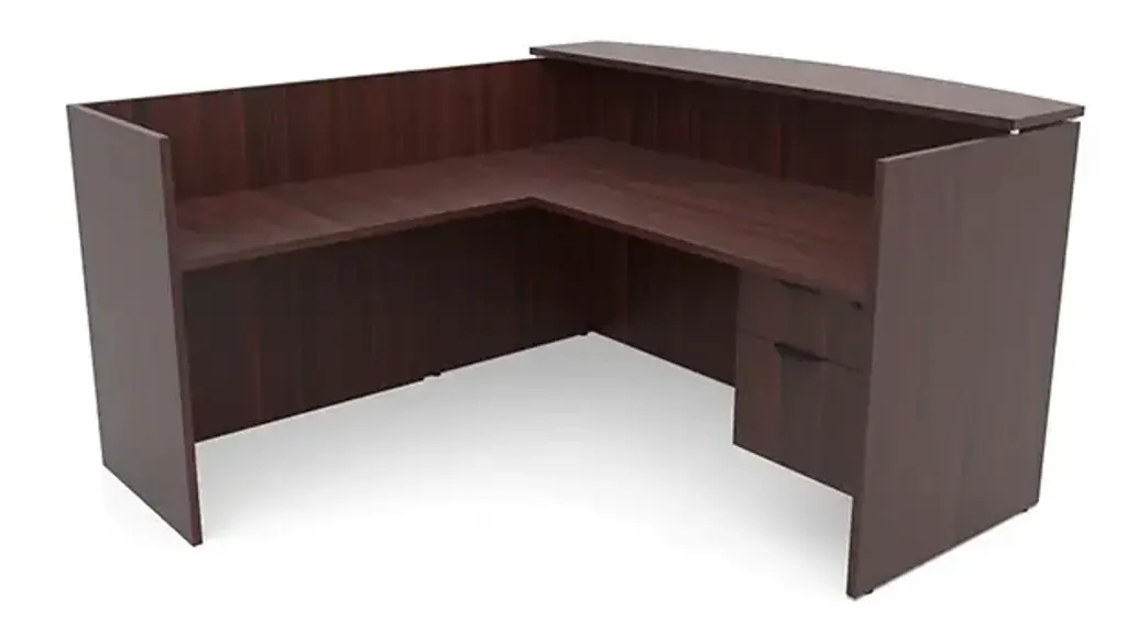 This Desk is Reversible PL Series L-Shaped reception desk has a durable laminate finish. Full height reception desk provides over 11 inches of privacy walls above the work surface. L-Shaped Reception Desk includes 3 grommets - 1 in each corner of the main desk and 1 centered on the back of edge of the return side. Available in several laminate finishes. Laminate transaction counter. Ships ready for easy assembly.