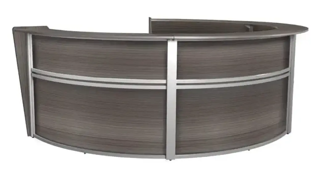 Introducing the ultimate reception desk solution - our beautifully designed, easy-to-assemble curved desk. With its advanced thermofused melamine finish and self-edge, this desk is not only functional but also a stunning addition to any office space. The sleek silver frame adds a touch of modernity and sophistication, making it the perfect piece to impress clients and guests. Spacious 19.75” D interior desk for your receptionist. Wire management cutouts on interior desk. And Leveling glides included allowing for ½” height adjustability. No tools required for assembly. Ships ready for easy assembly.