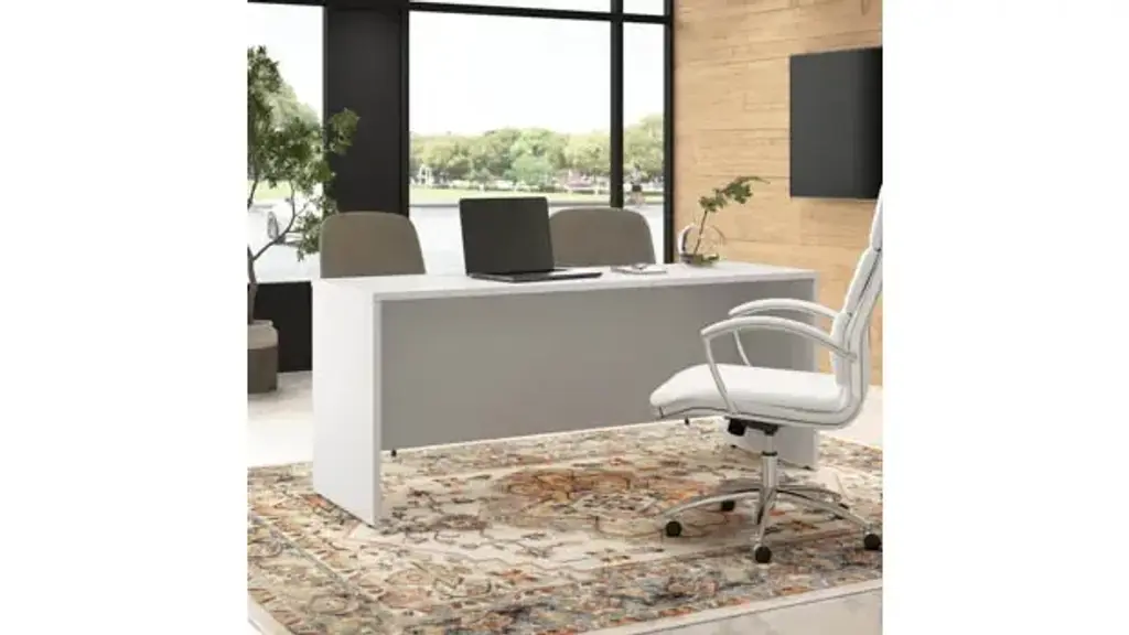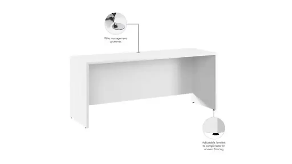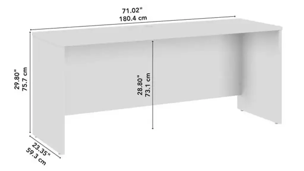 Highlighted by its distinctive design, the Bush Business Furniture Hampton Heights 72" W x 24" D Credenza Desk transforms any workspace into a captivating reflection of today's professional. A durable thermally fused laminate construction stands up to your 40-plus hour work week, resisting scratches, stains and dents to look great for years. Large surface offers space to spread out with integrated cable management to conceal computer cords. Shaker style designs and a fresh finish work perfectly in transitional and contemporary interiors. 3 built-in wire management grommets keep cords and cables out of the way so you can enjoy a clutter-free space. This desk can be used with coordinating Hampton Heights products to form L-Shaped and U Shaped Desks. The Credenza Desk accepts Mobile File Cabinets and other coordinating items from the Hampton Heights Collection (sold separately). Tested to meet ANSI/BIFMA quality standards for safety and performance. North American made with globally sourced materials. Overall Dimensions: 71.02" W x 23.35" D x 29.84" H. Ships ready for easy assembly.