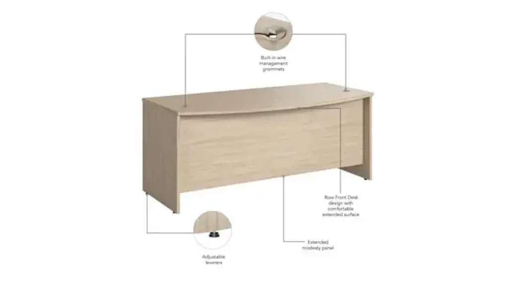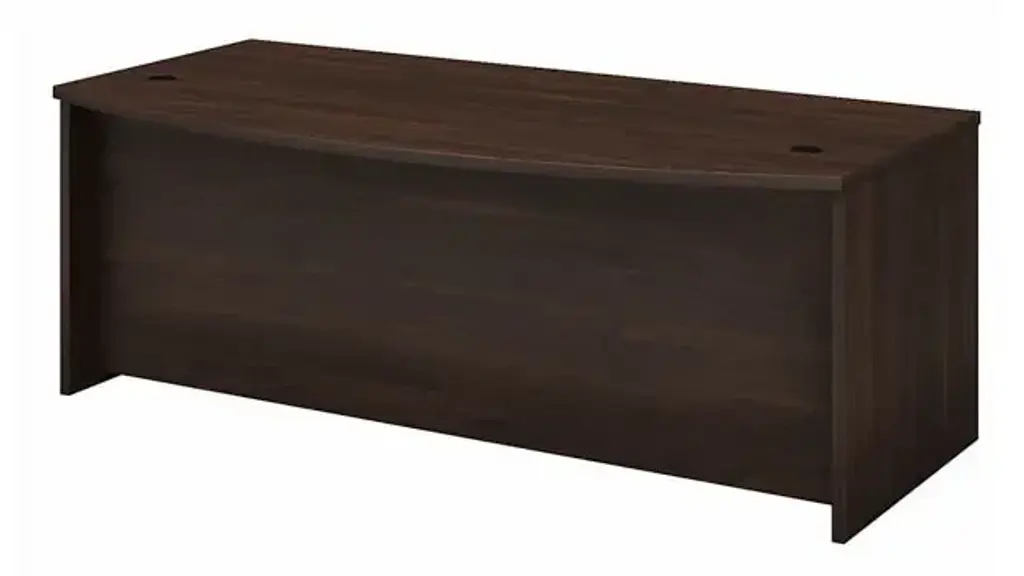 Give your office the quality you need and the style you deserve with the Bush Business Furniture Studio C - 72" W Bow Front Desk. The extended surface offers extra space to spread out with a computer and more while giving guests a rounded front to pull up a chair and collaborate. With a thermally fused laminate finish, the Bow Front Desk stands up to years of everyday use. The popular, classic office desk design receives a contemporary update with trendy finish options to fit seamlessly in a private office or as part of a larger environment. Keep pesky computer cords out of your way with the cable management system for an organized work surface. Combine the Bow Front Desk with matching products and accessories from the Studio C collection to create a unique office fit for the way you work. Meets ANSI/BIFMA quality test standards for performance and safety. See the full collection for coordinating items available to make your office your own with Studio C. American made with U.S. and imported parts. Overall Dimensions: 71.02" W x 35.43" D x 29.84" H. Ships ready for easy assembly.