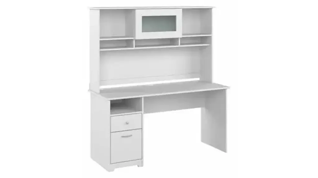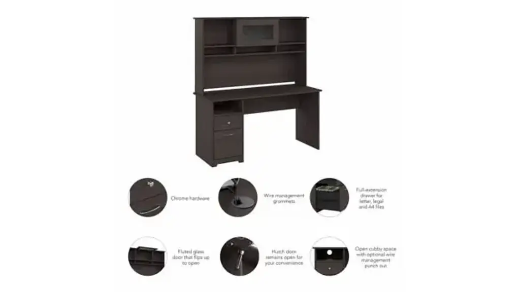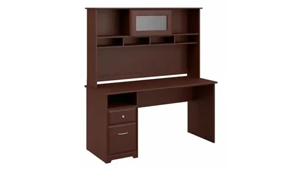 Create a stylish, functional and organized home office with the Bush Furniture Cabot 60"W Computer Desk with Hutch and Drawers. The spacious work surface allows you to spread out with your laptop, papers, printer and more with room to spare. Store files and supplies in the included drawers and open cubby shelf, designed for quick and easy access. A smooth full-extension drawer opens effortlessly on reliable ball bearing slides so you'll have no trouble reaching your letter or legal-size files. Beautiful Chrome-finished hardware is the perfect match for the Harvest Cherry finish, while the Hutch offers an eye-catching flip-up door and includes open storage space for books or decorations. The Computer Desk with Hutch and Drawers meets ANSI/SOHO quality test standards for safety and performance. See the full collection of coordinating home furnishings, and design your dream office with the elegant and efficient Cabot Collection. Overall Dimensions: 60"W x 23.19"D x 66.26"H. Ships ready for easy assembly.