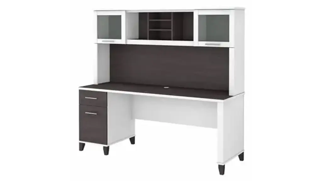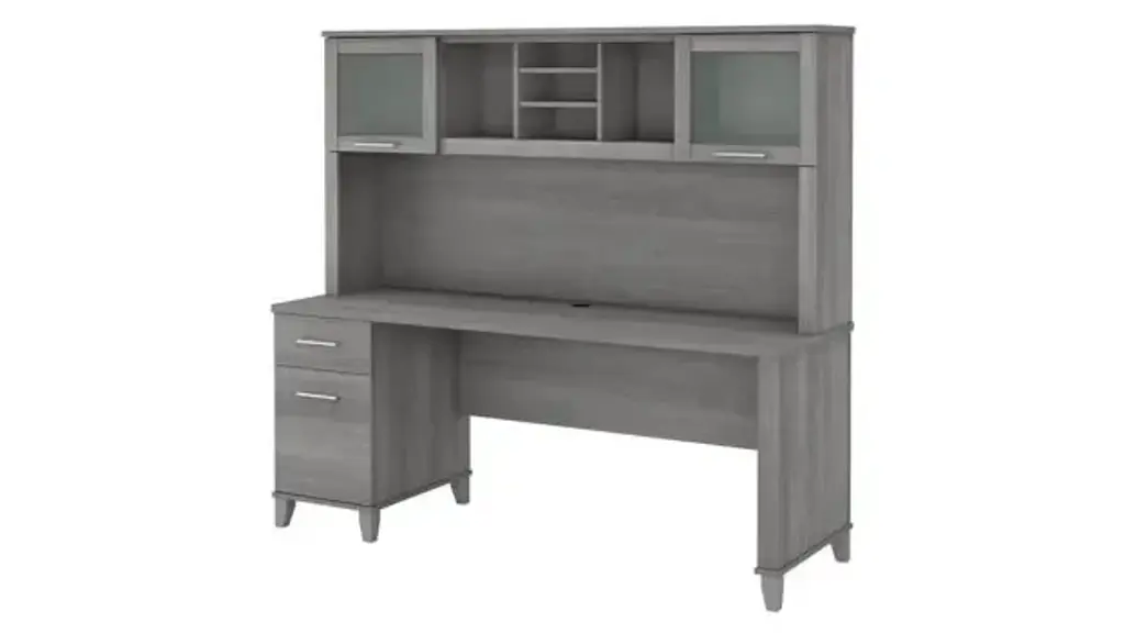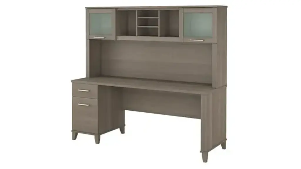 A spacious work surface and plenty of storage capacity make the Bush Furniture Somerset 72"W Office Desk with Hutch a perfect choice for your home office. Spread out with a computer and paperwork while multitasking on an expansive desktop that includes a convenient wire management grommet to keep cords and cables in order. The desk's file drawer opens on smooth full-extension ball bearing slides for easy access to legal and letter size documents, while a box drawer keeps the office supplies and utensils you need close by. Drawers can be mounted to either side of the desk for a custom configuration. The Hutch attaches to the desktop and adds a pair of lift-up frosted glass doors for concealed storage in addition to open cubby spaces with 2 adjustable shelves for books, binders, decorations and more. Somerset's transitional styling includes your choice of attractive laminate finishes with tapered leg accents and contemporary metal hardware for an appealing look that works with virtually any decor. The 72"W x 24"D computer desk can also be used with the coordinating Somerset 42"W 3 Position Sit to Stand Return (sold separately) to create an ergonomic height adjustable workspace. The Office Desk with Drawers and Hutch set is tested to meet ANSI/SOHO quality standards for safety and performance. See the full collection of Somerset home furnishings to expand your workspace. American made with U.S. and imported parts. Overall Dimensions: 71.02"W x 23.50"D x 64.96"H. Ships ready for easy assembly.