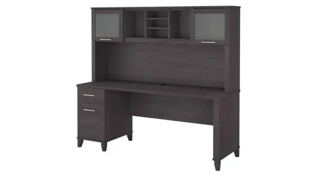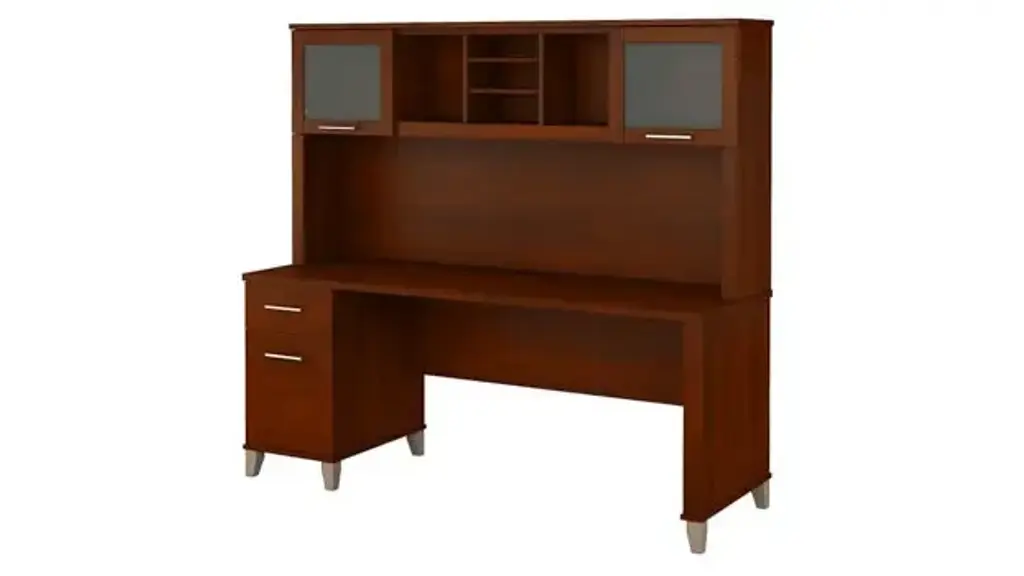 A spacious work surface and plenty of storage capacity make the Bush Furniture Somerset 72"W Office Desk with Hutch a perfect choice for your home office. Spread out with a computer and paperwork while multitasking on an expansive desktop that includes a convenient wire management grommet to keep cords and cables in order. The desk's file drawer opens on smooth full-extension ball bearing slides for easy access to legal and letter size documents, while a box drawer keeps the office supplies and utensils you need close by. Drawers can be mounted to either side of the desk for a custom configuration. The Hutch attaches to the desktop and adds a pair of lift-up frosted glass doors for concealed storage in addition to open cubby spaces with 2 adjustable shelves for books, binders, decorations and more. Somerset's transitional styling includes your choice of attractive laminate finishes with tapered leg accents and contemporary metal hardware for an appealing look that works with virtually any decor. The 72"W x 24"D computer desk can also be used with the coordinating Somerset 42"W 3 Position Sit to Stand Return (sold separately) to create an ergonomic height adjustable workspace. The Office Desk with Drawers and Hutch set is tested to meet ANSI/SOHO quality standards for safety and performance. See the full collection of Somerset home furnishings to expand your workspace. American made with U.S. and imported parts. Overall Dimensions: 71.02"W x 23.50"D x 64.96"H. Ships ready for easy assembly.