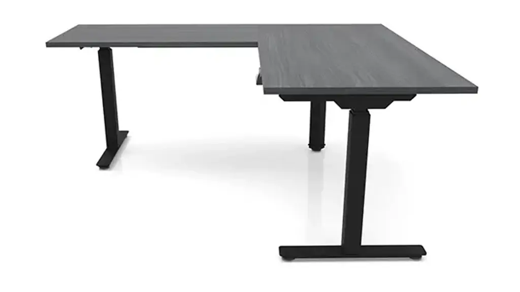 This Desk is Reversible StandUp Series Height adjustable 90 degree corner L desk allows you to work in the sitting or standing position. Raises the entire L shaped desk bringing all your work with you. Enjoy the health benefits of active working throughout the day as you change positions.  The 3 motor, 3 stage legs adjust the work surface from 24-1/2" to 50" high. Desk is designed to handle all your monitors and equipment as it can easily hold up to 310lbs.  Programmable height adjustment keypad allows you to program your preferred settings or move it up and down at the touch of a button. Available in several laminate top colors and 2 metal leg colors. Ships ready for easy assembly.