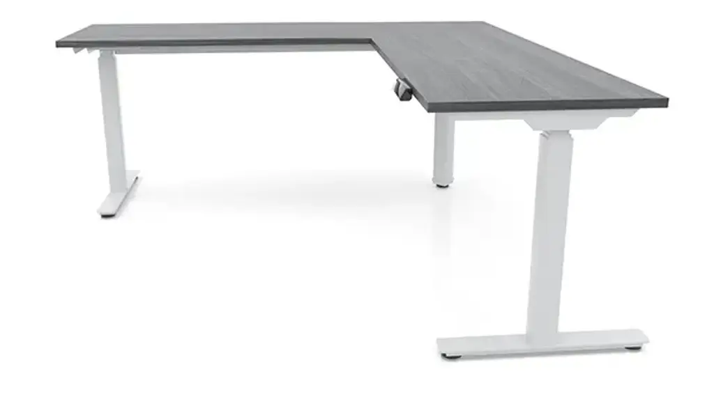 This Desk is Reversible StandUp Series Height adjustable 90 degree corner L desk allows you to work in the sitting or standing position. Raises the entire L shaped desk bringing all your work with you. Enjoy the health benefits of active working throughout the day as you change positions. The 3 motor, 3 stage legs adjust the work surface from 24-1/2" to 50" high. Desk is designed to handle all your monitors and equipment as it can easily hold up to 310lbs. Programmable height adjustment keypad allows you to program your preferred settings or move it up and down at the touch of a button. Available in several laminate top colors and 2 metal leg colors. Ships ready for easy assembly.