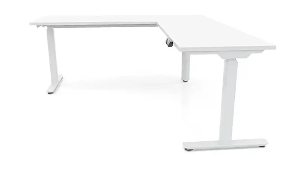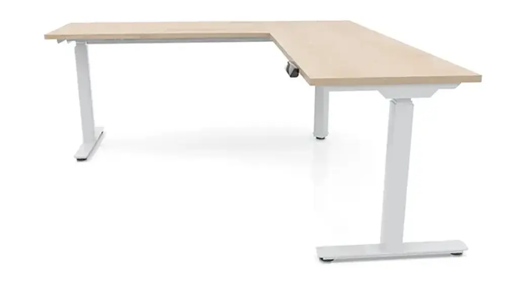 This Desk is Reversible StandUp Series Height adjustable 90 degree corner L desk allows you to work in the sitting or standing position. Raises the entire L shaped desk bringing all your work with you. Enjoy the health benefits of active working throughout the day as you change positions. The 3 motor, 3 stage legs adjust the work surface from 24-1/2" to 50" high. Desk is designed to handle all your monitors and equipment as it can easily hold up to 310lbs. Programmable height adjustment keypad allows you to program your preferred settings or move it up and down at the touch of a button. Available in several laminate top colors and 2 metal leg colors. Ships ready for easy assembly.