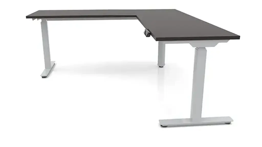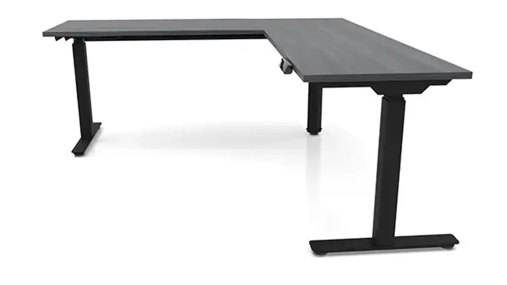 This Desk is Reversible StandUp Series Height adjustable 90 degree corner L desk allows you to work in the sitting or standing position. Raises the entire L shaped desk bringing all your work with you. Enjoy the health benefits of active working throughout the day as you change positions. The 3 motor, 3 stage legs adjust the work surface from 24-1/2" to 50" high. Desk is designed to handle all your monitors and equipment as it can easily hold up to 310 lbs. Programmable height adjustment keypad allows you to program your preferred settings or move it up and down at the touch of a button. Available in several laminate top colors and 2 metal leg colors. Ships ready for easy assembly.