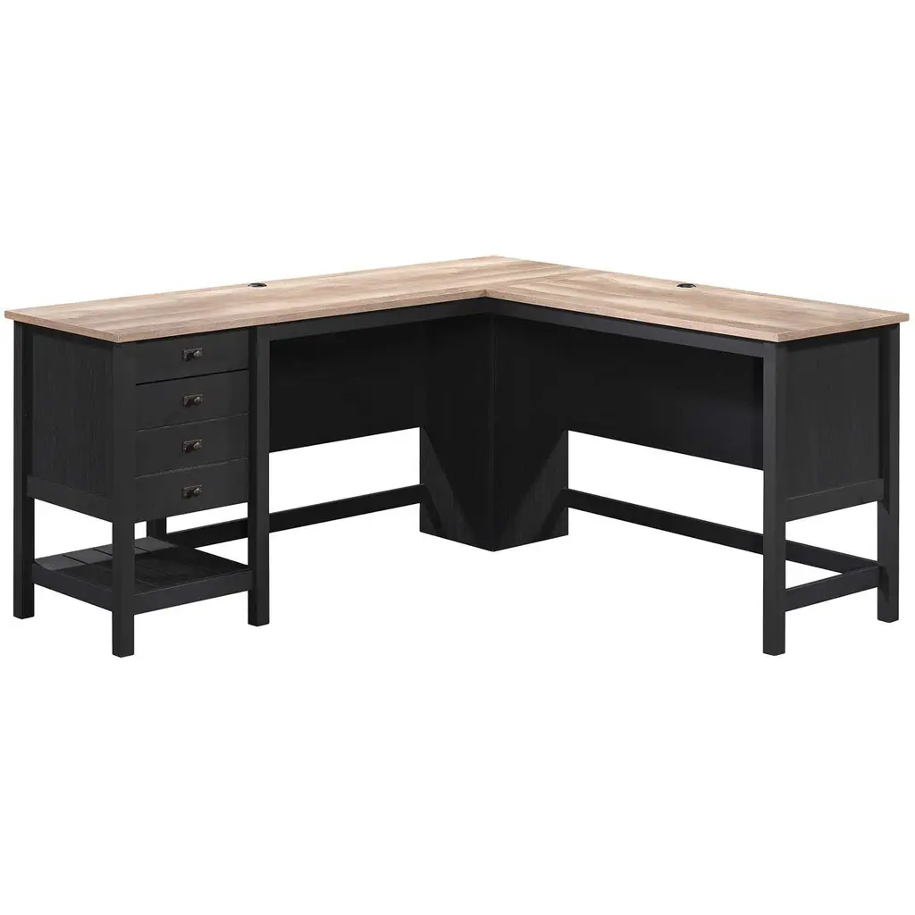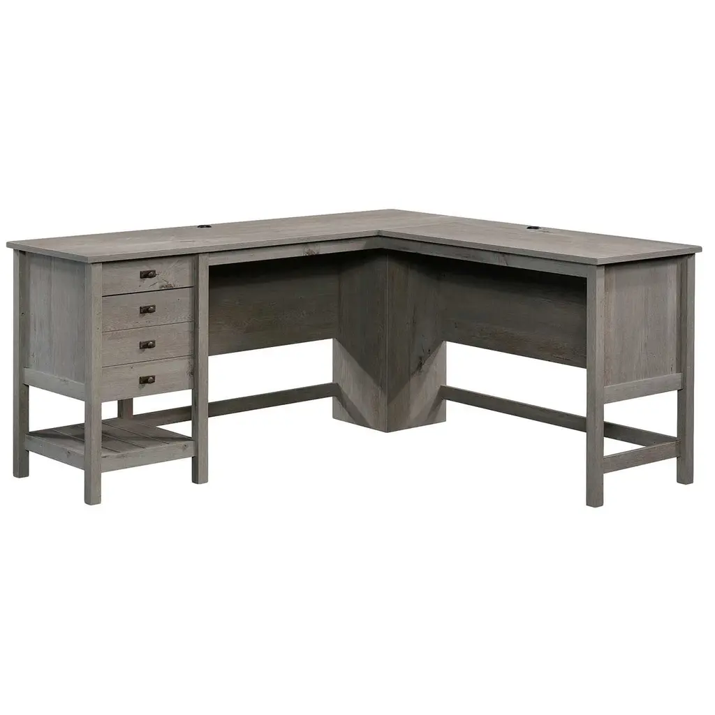 Kingston emanates an air of an English country manor. Dark chocolate rub through finish is softly worn to enhance the wood and give a naturally aged look to the collection. Criss-cross detail adds interest and dimension to drawer fronts and panels, while mottled antique hardware enhance the look of the group. Features two pencil drawers, two utility drawers, Power center with AC power outlets and USB 2.0 ports for convenient charging, and two gromments for wire management. Finished on all sides. Overall Dimensions: 60" W x 71" D x 30-45" H Height adjusts from 30"-45". Ships ready for easy assembly.