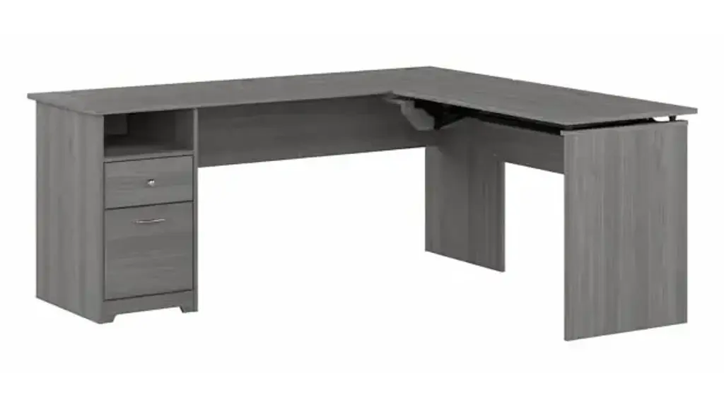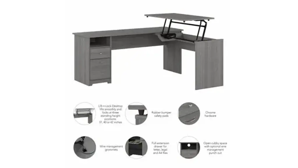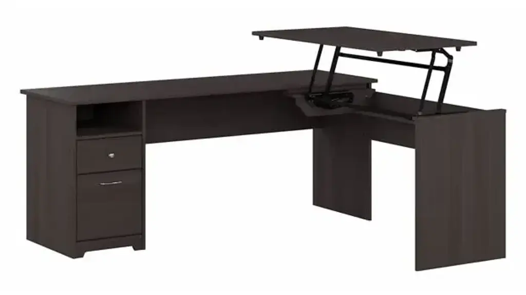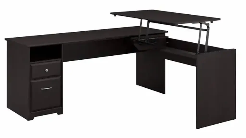 The Cabot L-Shaped Sit to Stand Desk turns your home office into an ergonomic workstation designed to help you get organized and be more productive. With a wide work surface you'll enjoy plenty of room for multitasking, and you can save space as the adjustable desk fits perfectly in a corner. Smoothly lift and lock the Return desktop to standing height positions of 37", 40" or 43" from the floor and work comfortably, or use the easy adjust-ability and have a seat when your legs get tired. The Return desktop holds up to 20 lbs. when at standing height so you can bring materials with you when you need to stretch your legs. Organize your work space as this desk with storage includes a box drawer and cubby shelf for supplies, along with a full-extension file drawer.  Chrome-finished hardware complements the laminate finish. The L-Shaped Sit to Stand Desk meets ANSI/SOHO quality test standards for safety and performance. See the full collection of coordinating home furnishings, and design your dream office with the elegant and efficient Cabot Collection. Overall Dimensions: 72.01" W x 66.12" D x 29.5" H. Ships ready for easy assembly.