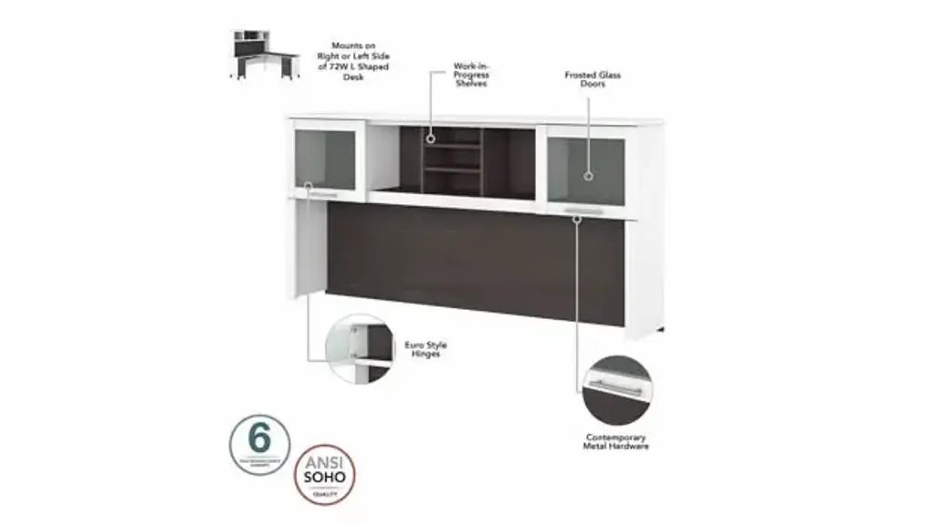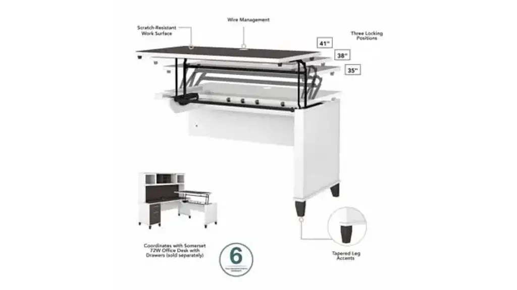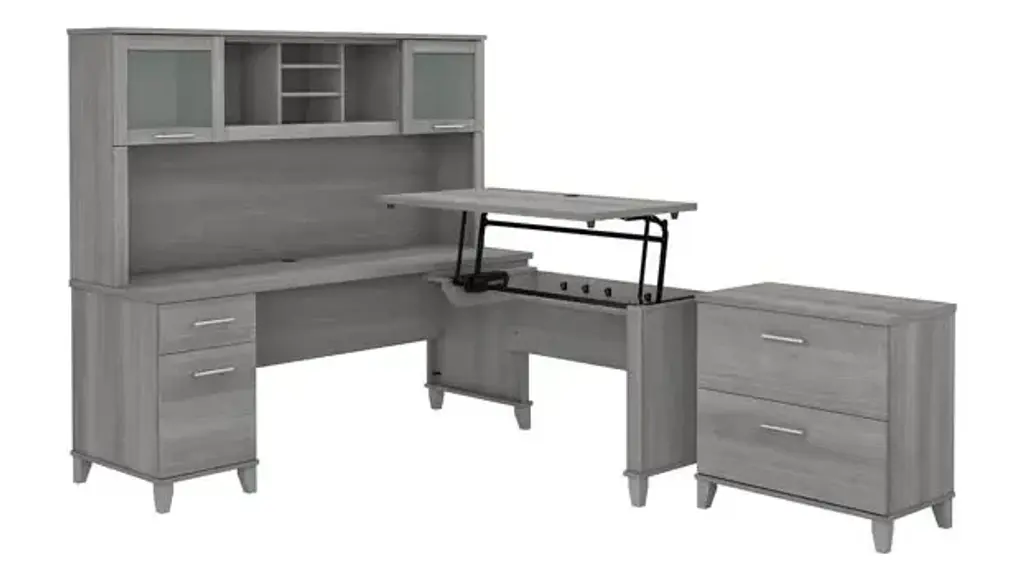 This Desk is Reversible The Bush Furniture Somerset 72"W 3 Position Sit to Stand L-Shaped Desk with Hutch and Lateral File Cabinet offers an ideal solution for those seeking a stylish and functional ergonomic workspace. As a quality alternative to desktop risers, the innovative 42"W x 24"D Sit to Stand Return offers all the health benefits of a standing desk with the versatility of more expensive electric height adjustable options. The mechanical Lift-n-Lock system allows the desktop to lock into place at standing heights of 37", 40", and 43" and easily returns to a seated position. The 72"W x 24"D Office Desk includes its own storage with a file drawer and a box drawer for documents and supplies you want to keep close by. Both surfaces have wire management grommets to keep cords in order. The Hutch attaches to the desktop and adds 2 lift-up frosted glass doors for concealed storage in addition to open cubby spaces with 2 adjustable shelves. The 2 drawer filing cabinet accepts legal and letter size files and opens on smooth full-extension ball bearing slides. Available in your choice of laminate finishes with contemporary metal hardware and tapered leg accents, the height adjustable corner desk has an appealing look that works with virtually any decor. Fixed surfaces are tested to meet ANSI/SOHO standards for safety and performance while the mechanical lift system is rigorously tested to Bush Furniture's own quality standards. American Made with US and imported parts. Overall Dimensions: 71.02"W x 71.75"D x 64.96"H. Ships ready for easy assembly.