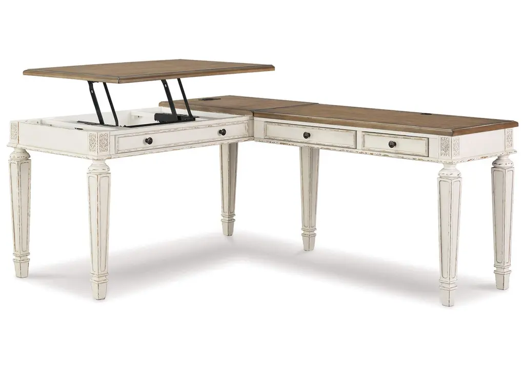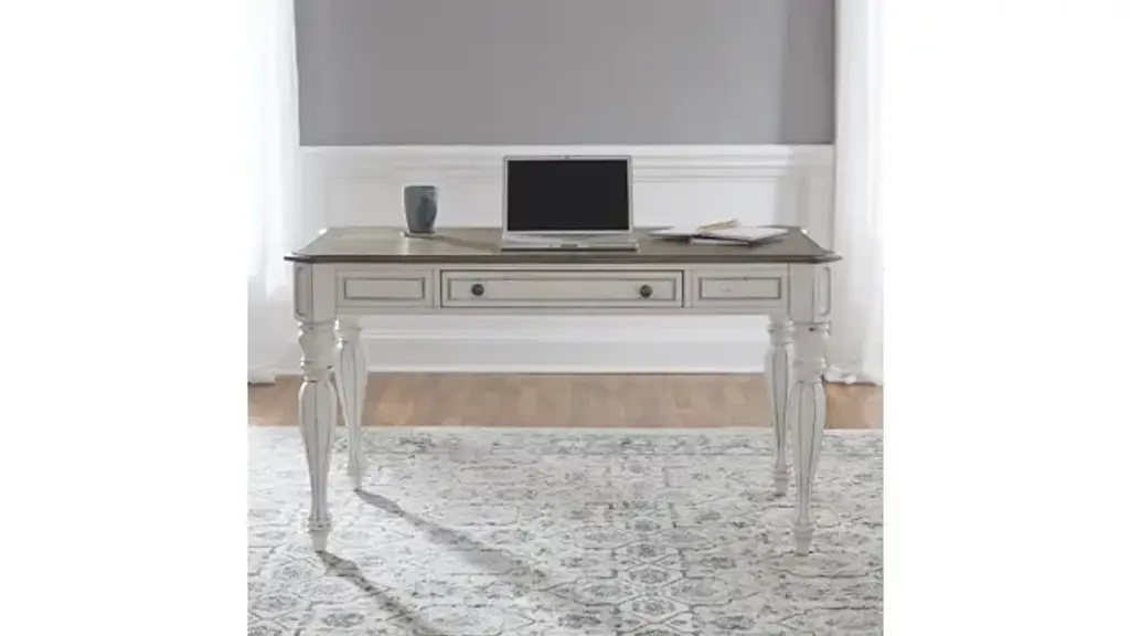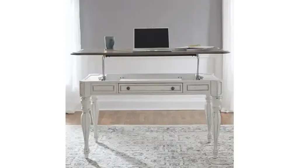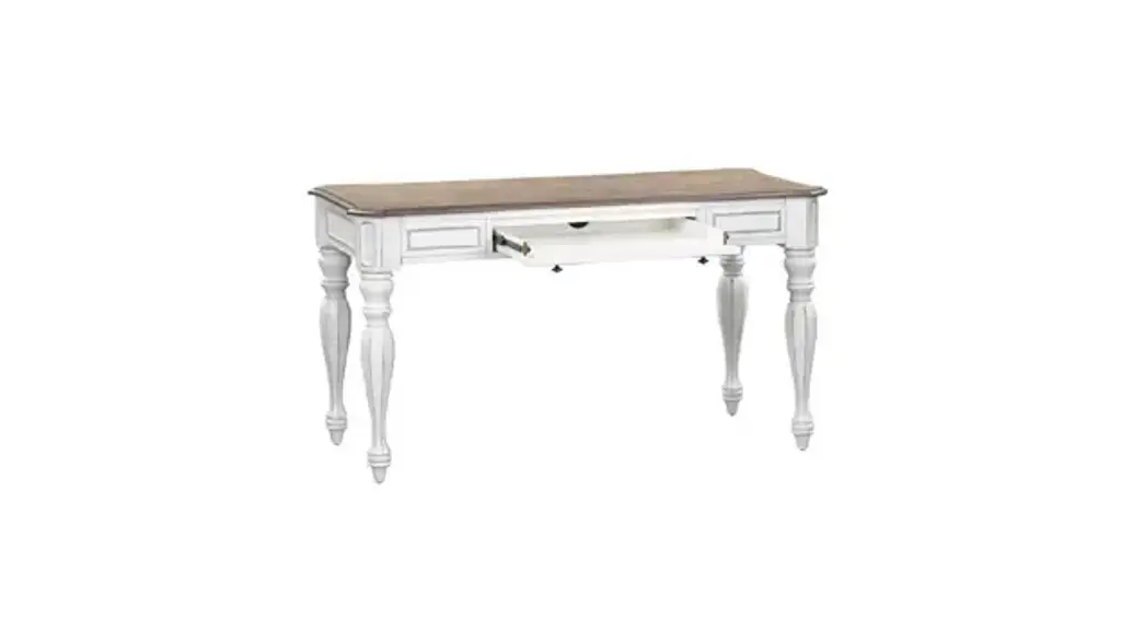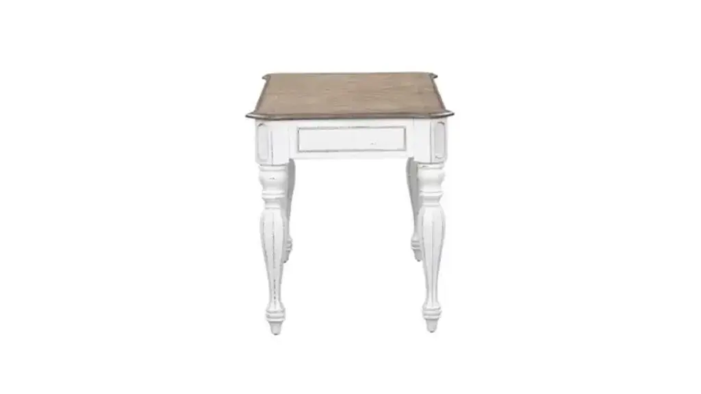 It’s never been easier to be elegant with the Magnolia Manor lift-top writing desk. Crafted of poplar and rubberwood solids with white oak and birch veneers, this piece features an antique white finish with heavy chipping and distressing with a weathered brown top with whitewash. The top has a unique fancy face veneer pattern with canted corners and offers one the ability to lift it up to work while standing. There is one full extension drawer framed with bead molding that is also a flip-down keyboard tray. Faceted turned legs add character to this desk. Blending of European influences makes Magnolia Manor a truly unique style for any home. Overall Dimensions: 56" W x 28" D x 30" H. 40.5" When Opened. Ships ready for easy setup.