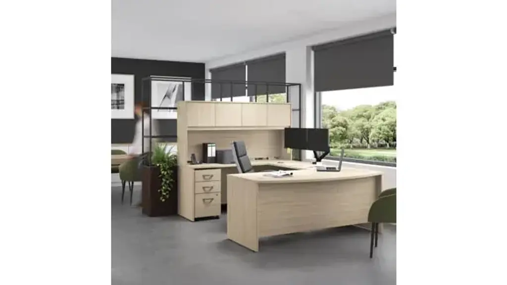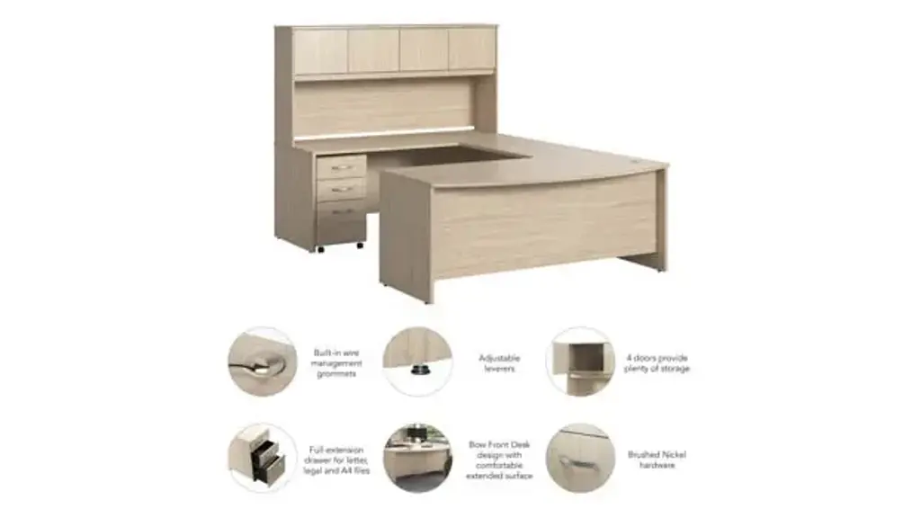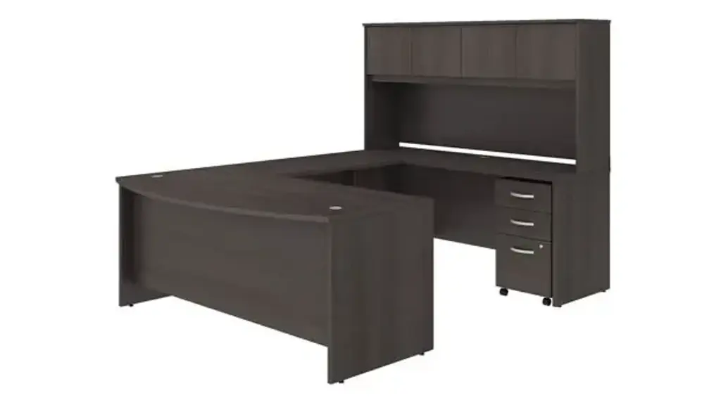 This Desk is Reversible Give your office the workspace you need and the style you deserve with this Bush Business Furniture Studio C U-Shaped Desk with Hutch and Assembled Mobile File Cabinet. The extended surface of the 72" W x 36" Bow Front Desk offers guests a rounded front to pull up a chair and collaborate, while the expansive U-shaped configuration has all the room you could ever want to spread out and multitask. With a thermally fused laminate finish, this office set stands up to years of everyday use. Keep pesky computer cords out of your way with a cable management system for a neat work surface. With 4 doors featuring self-closing Euro-style hinges, the Hutch conveniently stores office supplies, books and more. The 3 Drawer Mobile File Cabinet rolls with you throughout your office or remains in place as needed on any surface. The popular, classic office furniture design receives a contemporary update with trendy finish options to fit seamlessly in a private office or as part of a larger environment. Meets ANSI/BIFMA quality test standards for performance and safety. American made with U.S. and imported parts. Overall Dimensions: 71.02" W x 100.43" D x 65.84" H. Ships ready for easy assembly, File Cabinet ships fully assembled.
